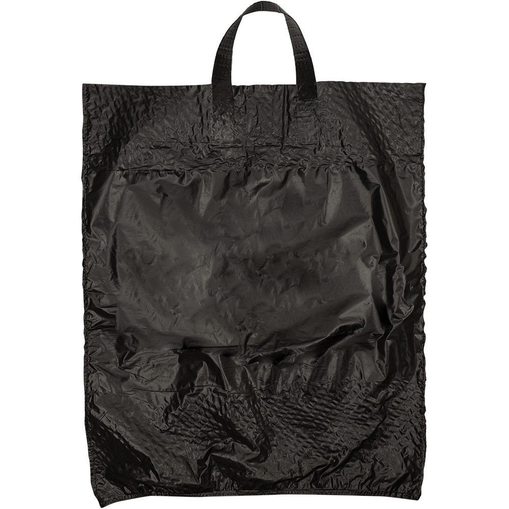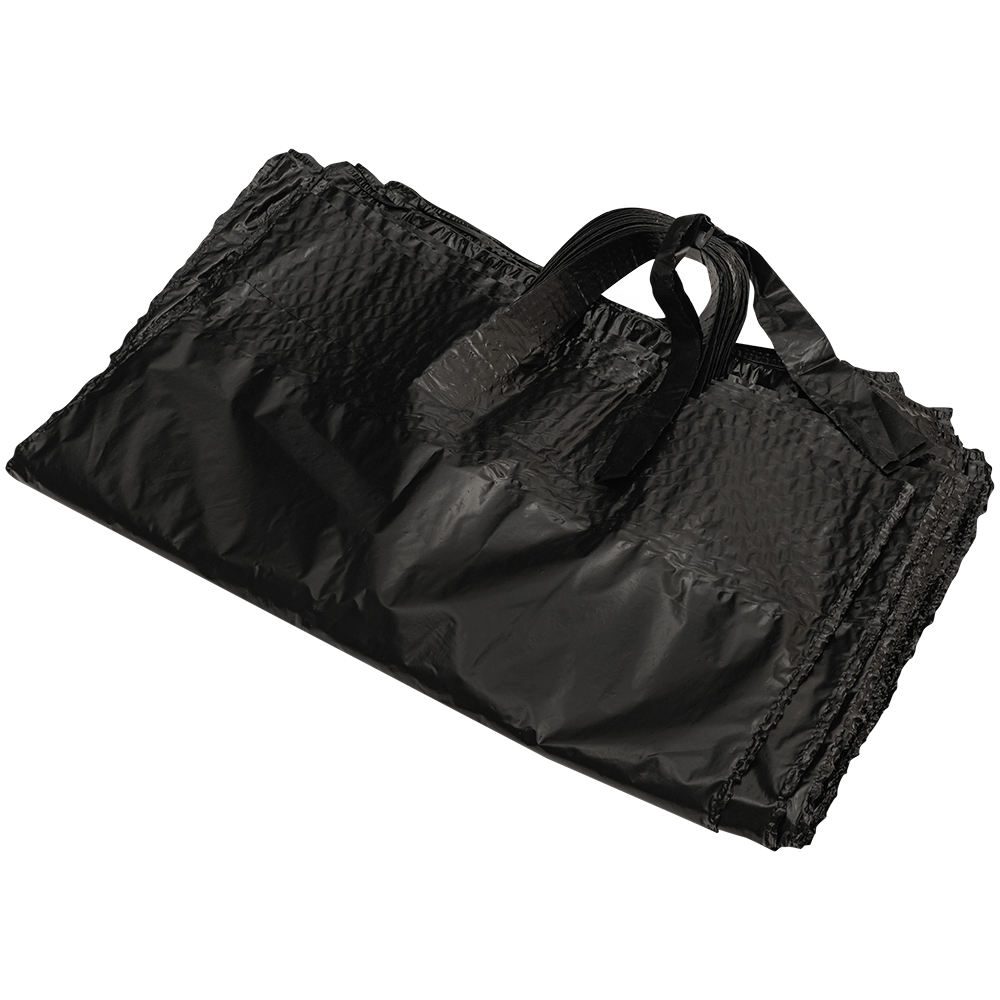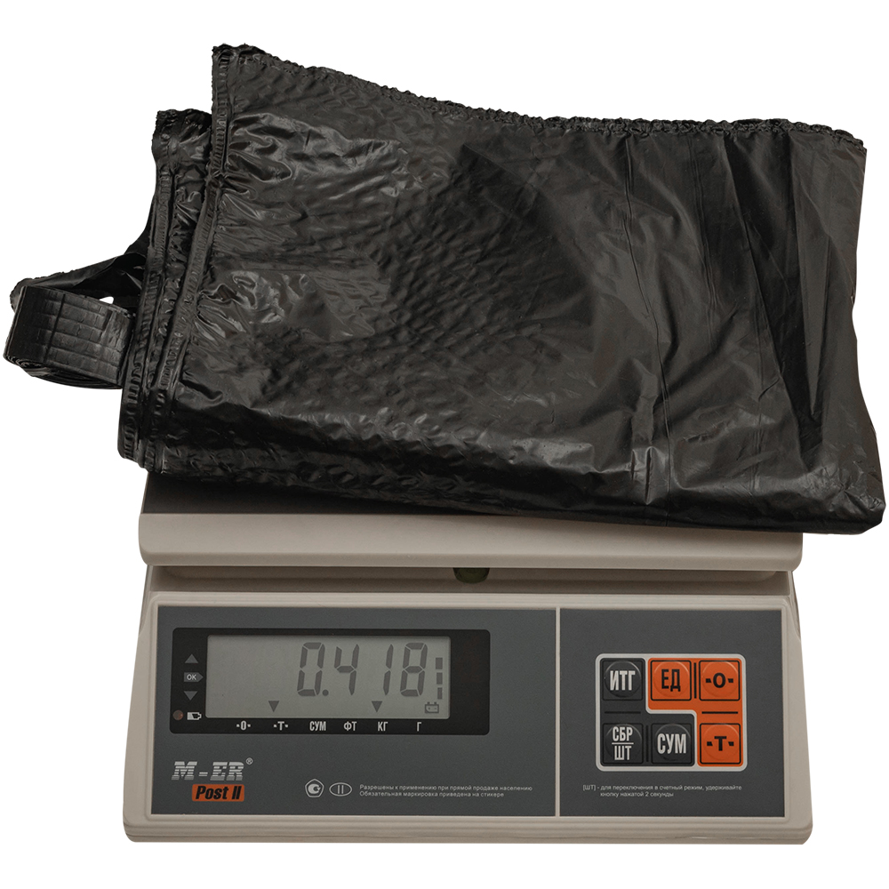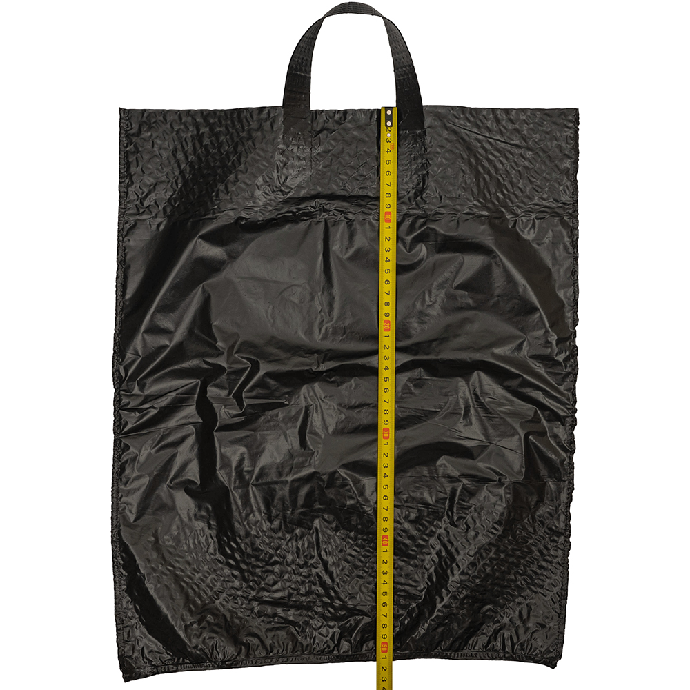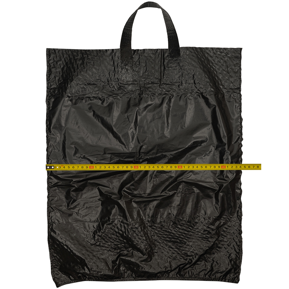 Чёрные полиэтиленовые пакеты ПВД с петлевой ручкой («Орловская» сумка), длиной 50 см, шириной 45 см, толщиной 80 мкм, в упаковке 10 штук. Материал – полиэтилен высокого давления. Производятся в России.