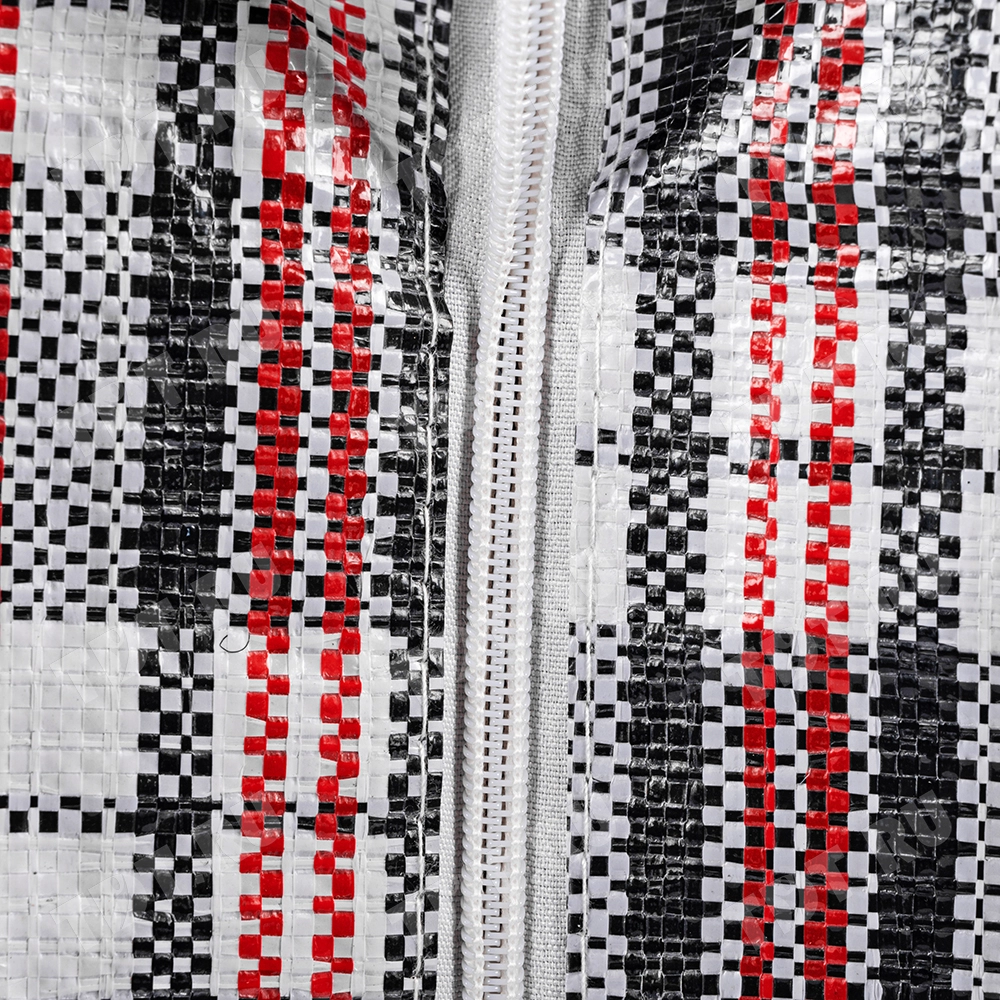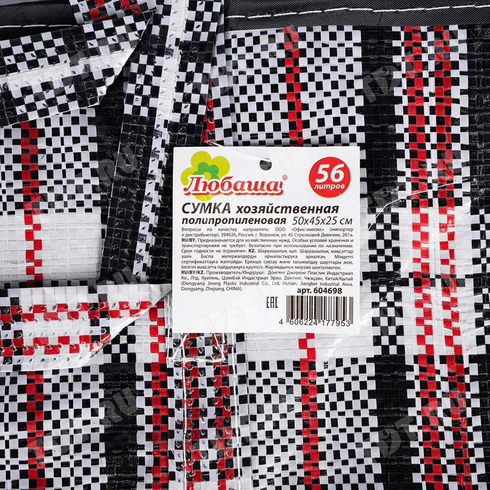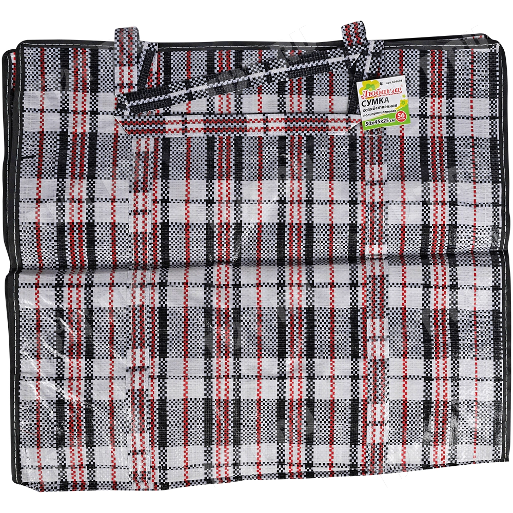 Сумка-баул однослойная хозяйственная длиной 50 см, шириной 25 см, высотой 45 см, объемом 56 л, чёрно-красная. Материал полипропилен. Имеет прострочку по периметру. Занимает мало места в сложенном виде. Производится в Китае.