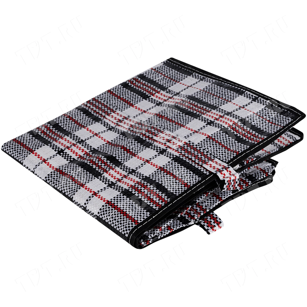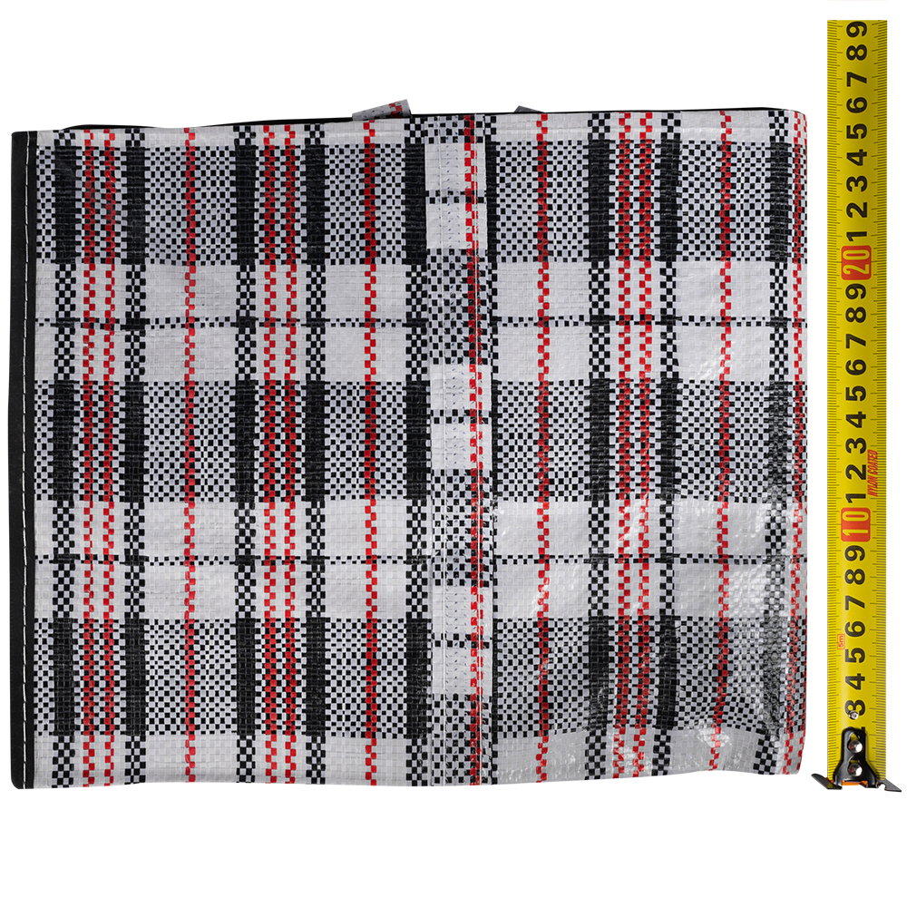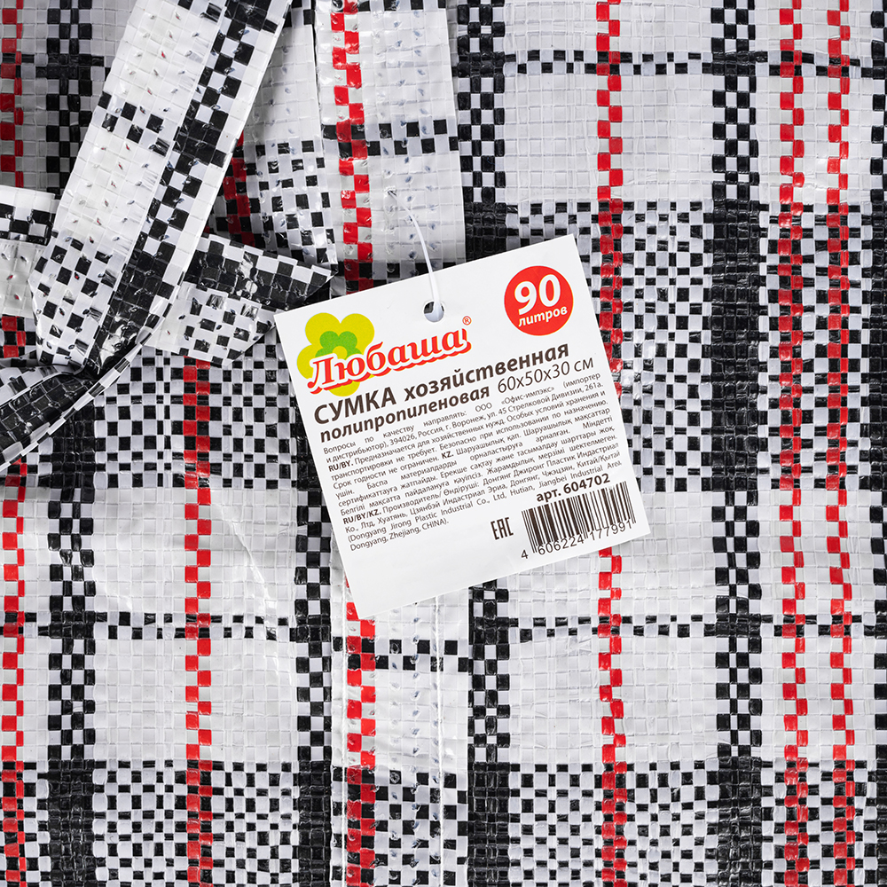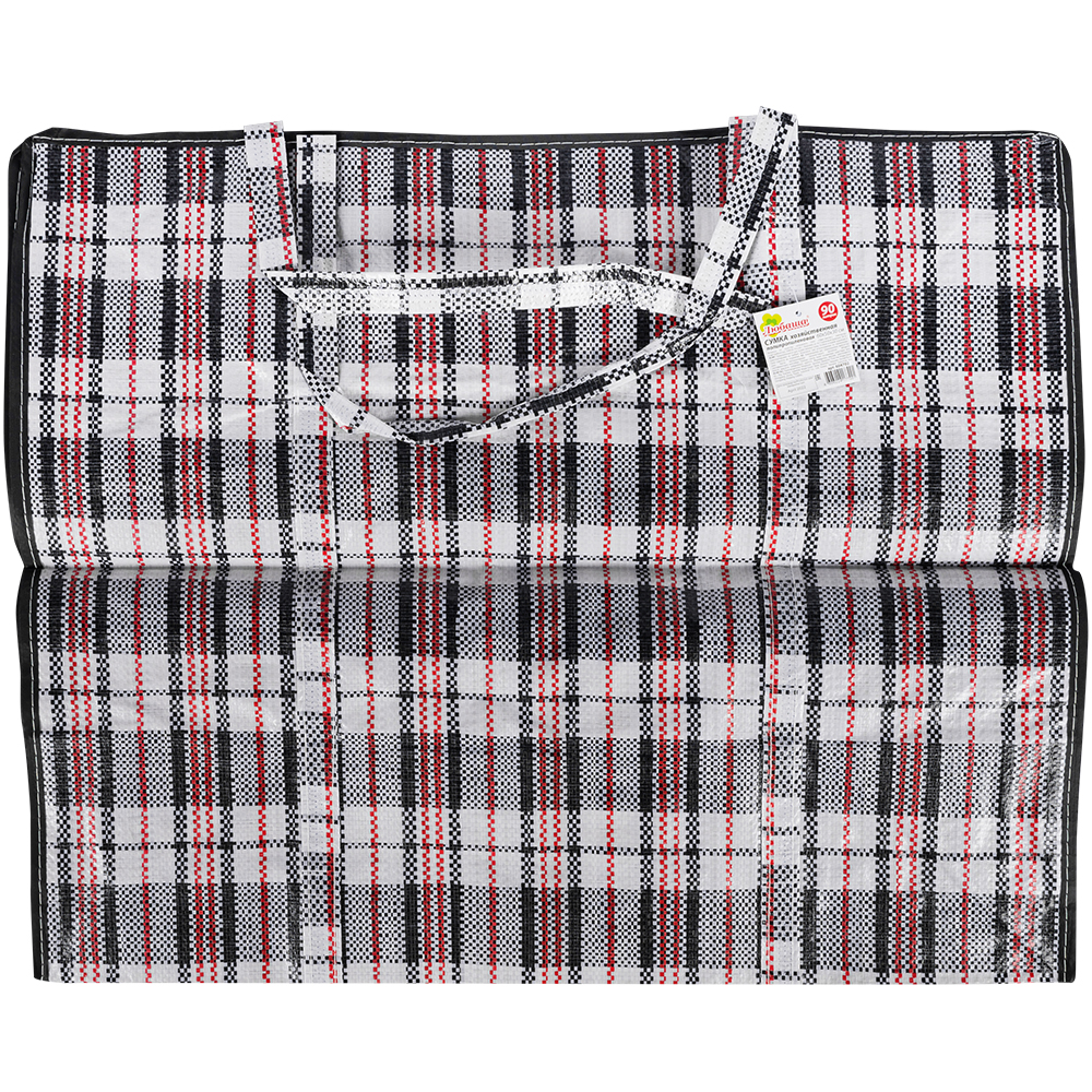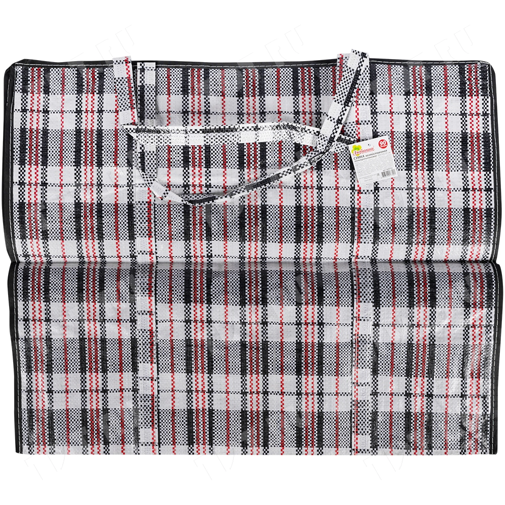 Большая сумка однослойная хозяйственная длиной 60 см, шириной 30 см, высотой 50 см, объемом 90 л, чёрно-красная. Материал полипропилен. Имеет прострочку по периметру. Занимает мало места в сложенном виде. Производится в Китае.