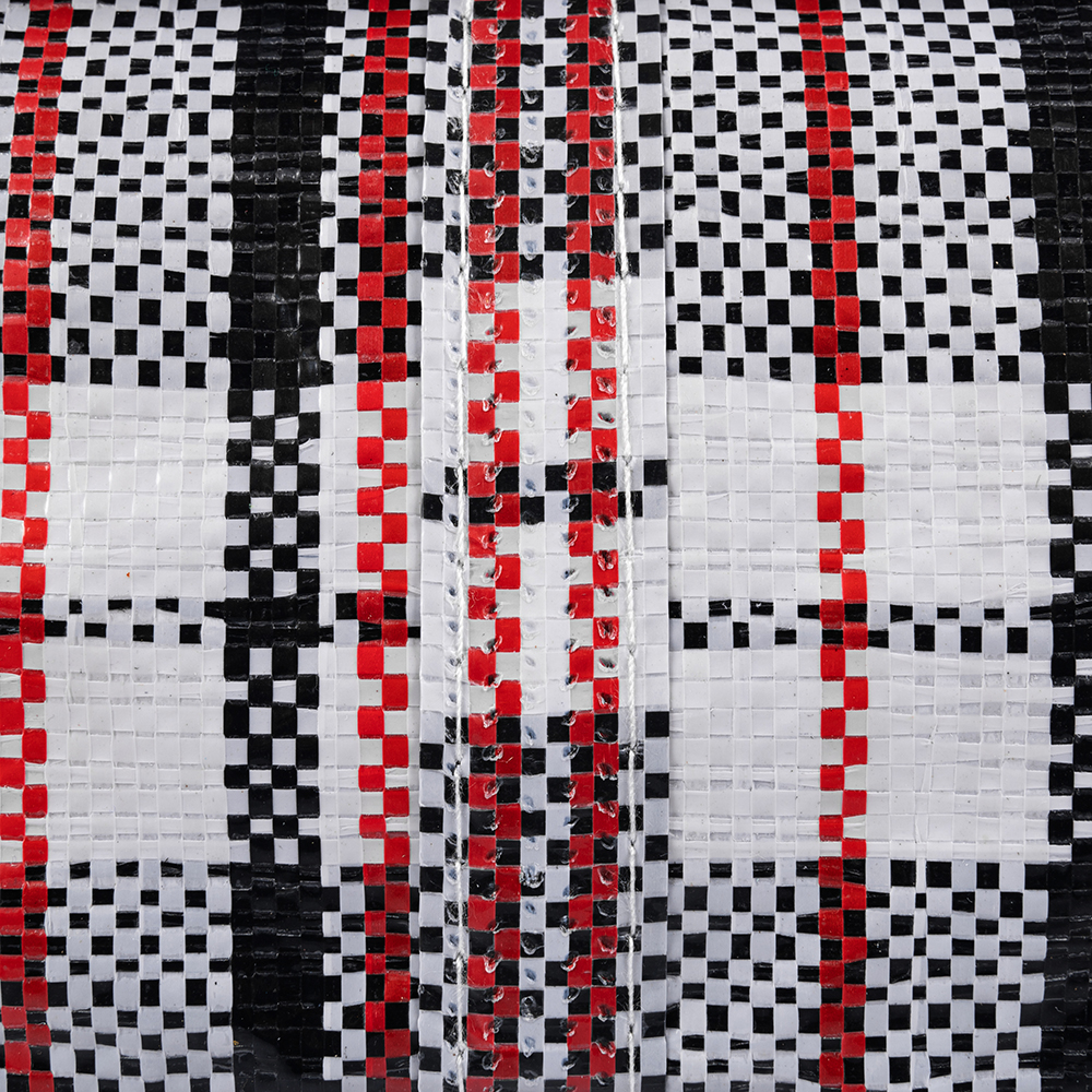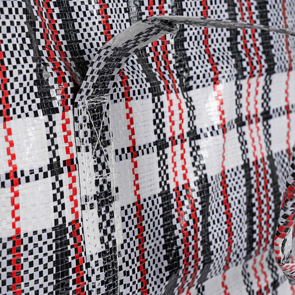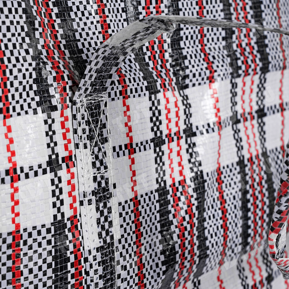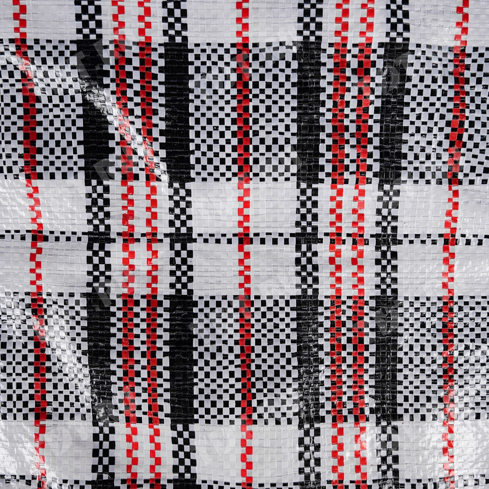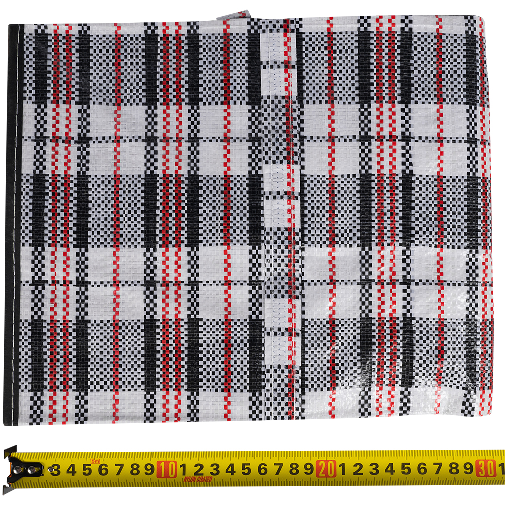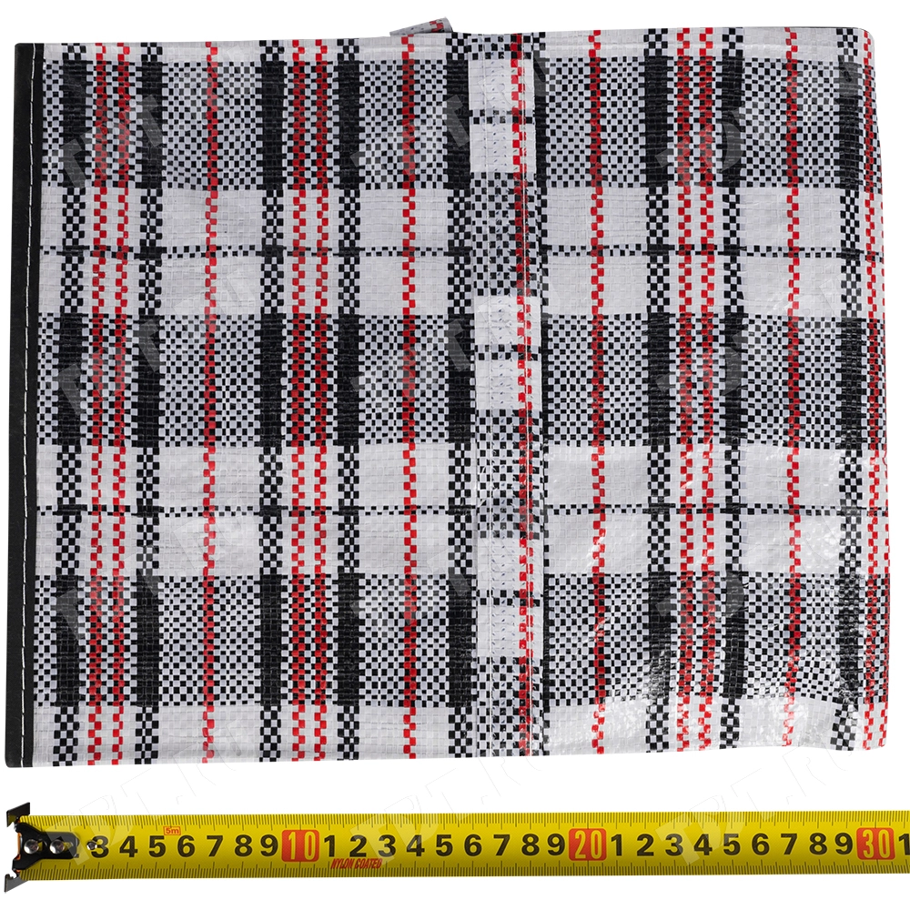 Большая сумка однослойная хозяйственная длиной 60 см, шириной 30 см, высотой 50 см, объемом 90 л, чёрно-красная. Материал полипропилен. Имеет прострочку по периметру. Занимает мало места в сложенном виде. Производится в Китае.