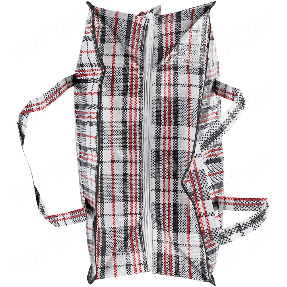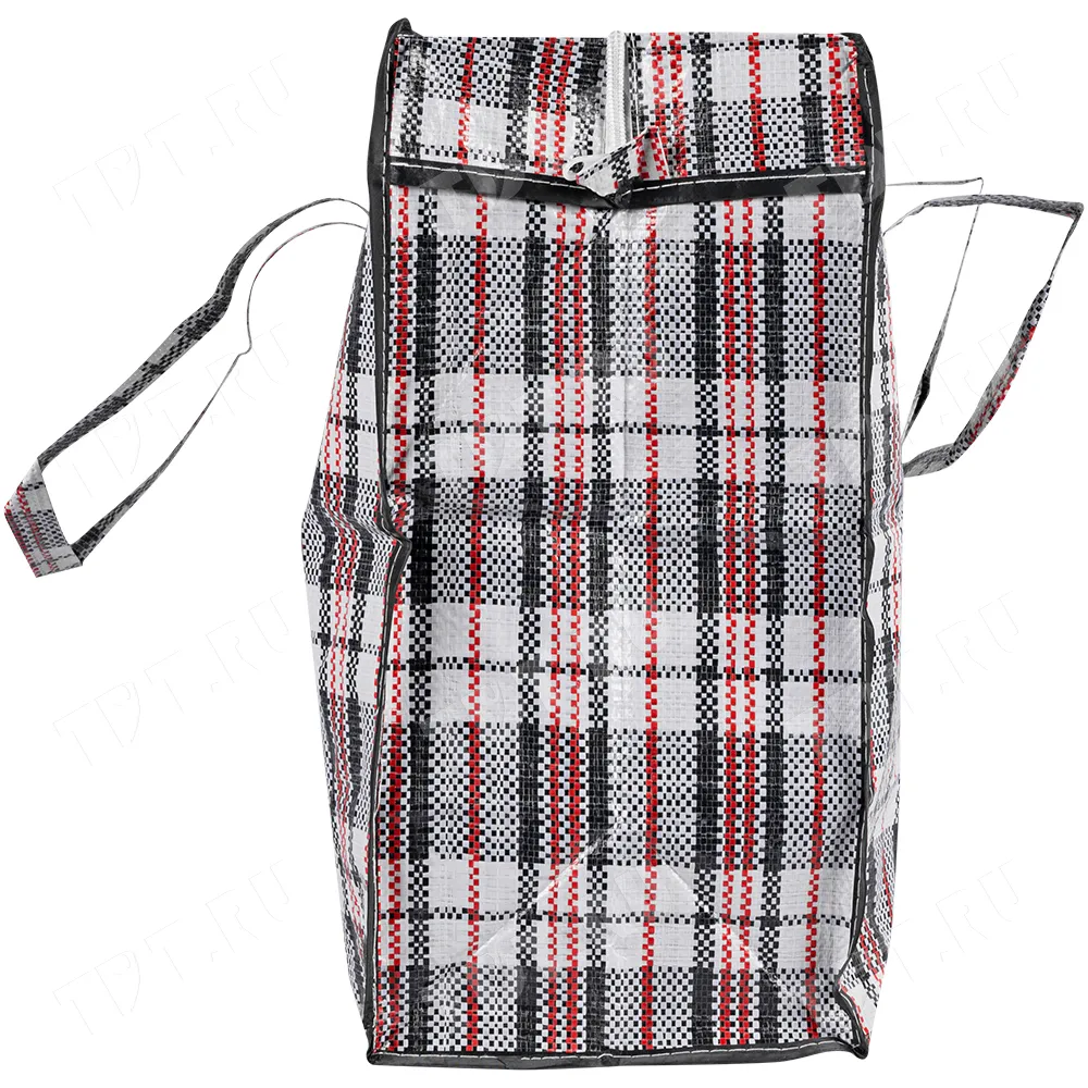 Большая сумка однослойная хозяйственная длиной 70 см, шириной 30 см, высотой 50 см, объемом 105 л, чёрно-красная. Материал полипропилен. Имеет прострочку по периметру. Занимает мало места в сложенном виде. Производится в Китае.
