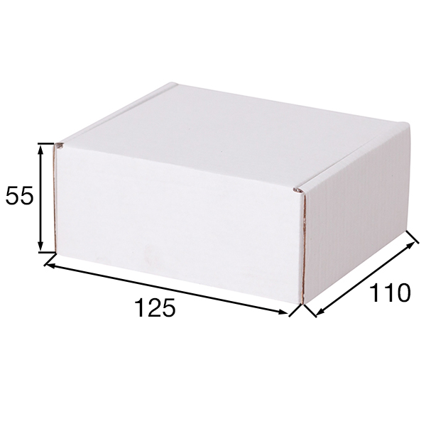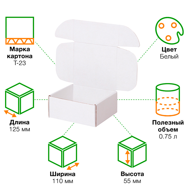 Короб КС-407 МГФ, серии КС-400, белый, длиной 125 мм, шириной 110 мм и высотой 55 мм. Изготовлен из микрогофрокартона Т-23. Полезный объём — 0.75 л.