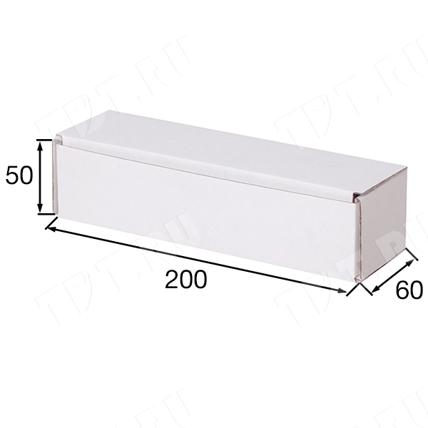 Короб КС-409 МГФ, серии КС-400, белый, длиной 200 мм, шириной 60 мм и высотой 50 мм. Изготовлен из микрогофрокартона Т-23. Полезный объём — 0.6 л.
