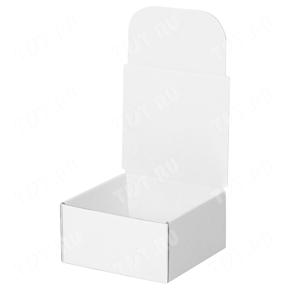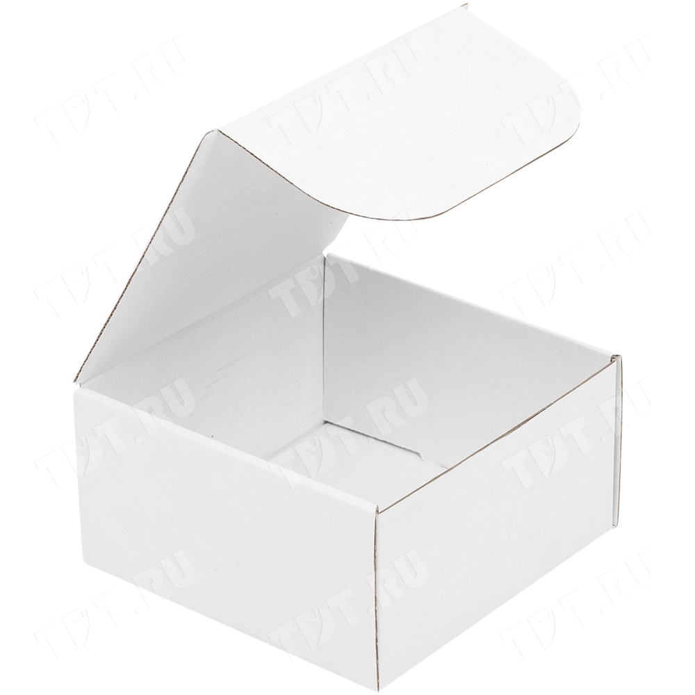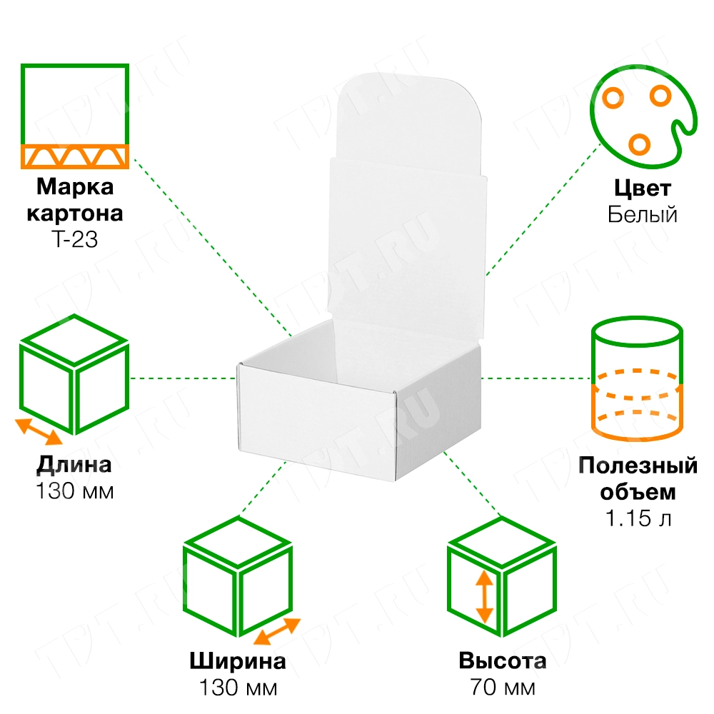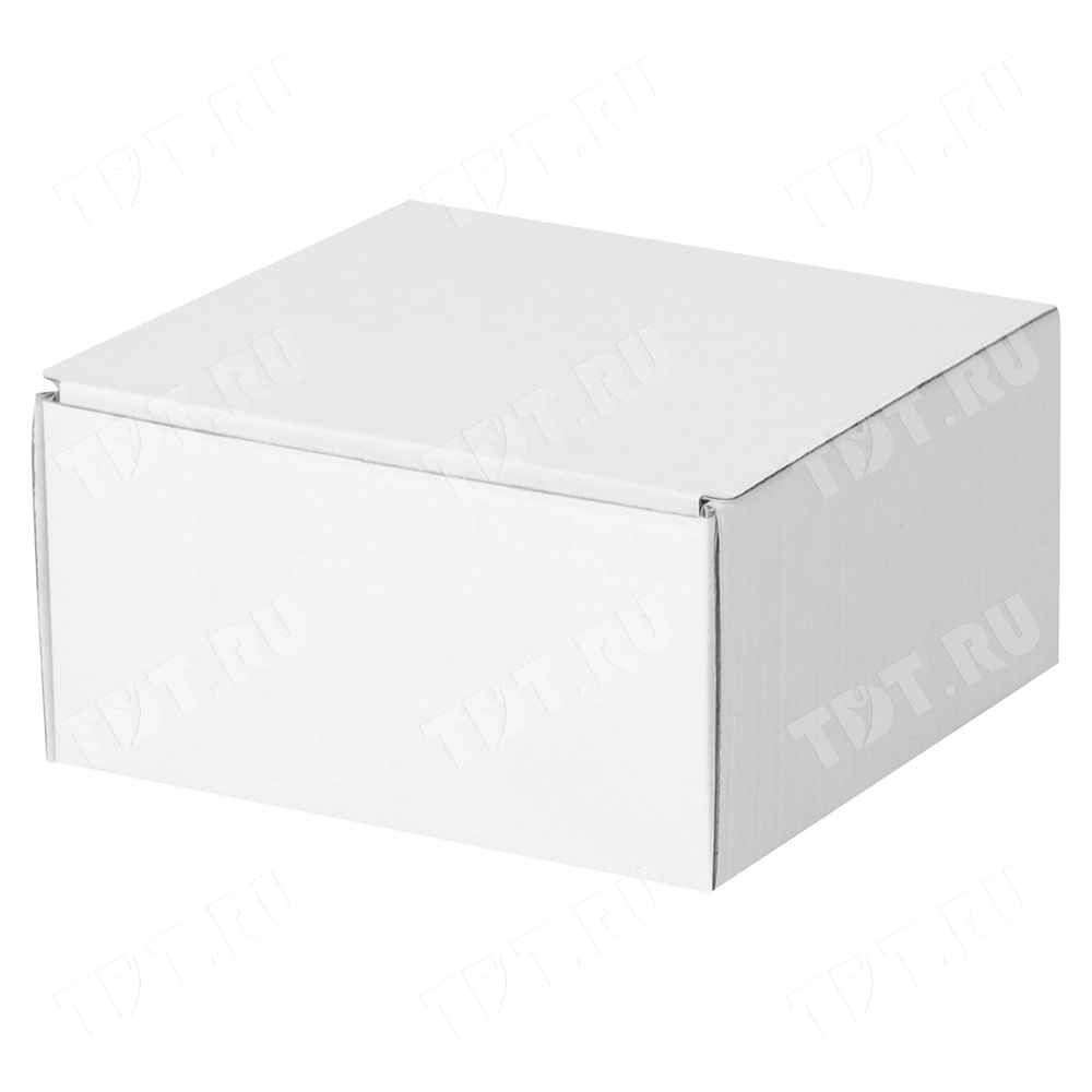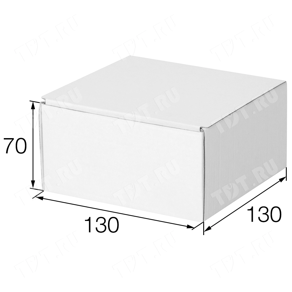 Короб КС-410 МГФ, серии КС-400, белый, длиной 130 мм, шириной 130 мм и высотой 70 мм. Изготовлен из микрогофрокартона Т-23. Полезный объём — 1.15 л.