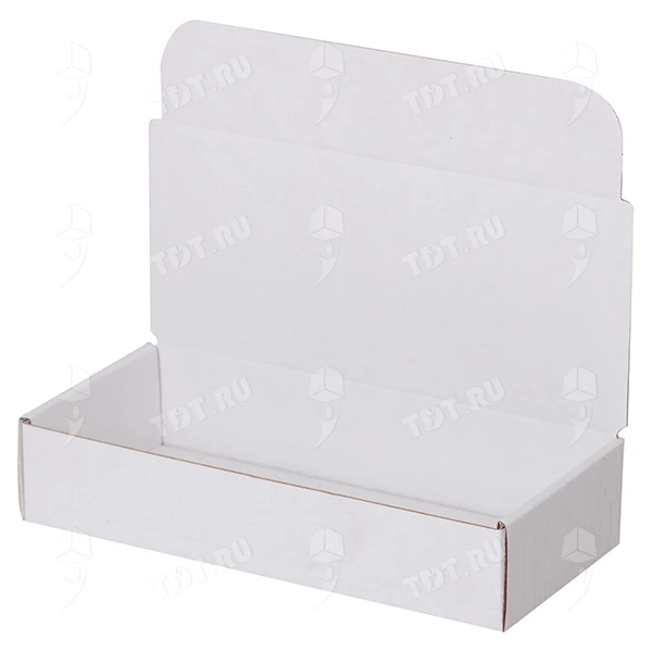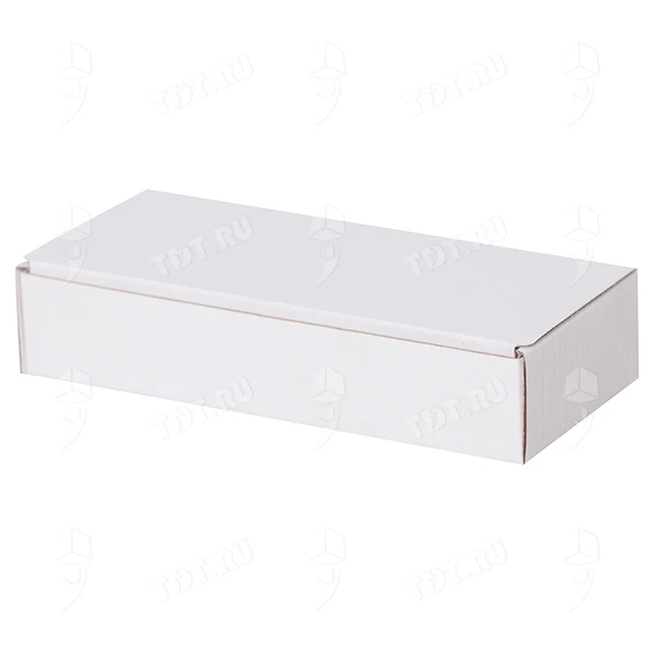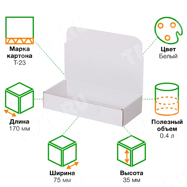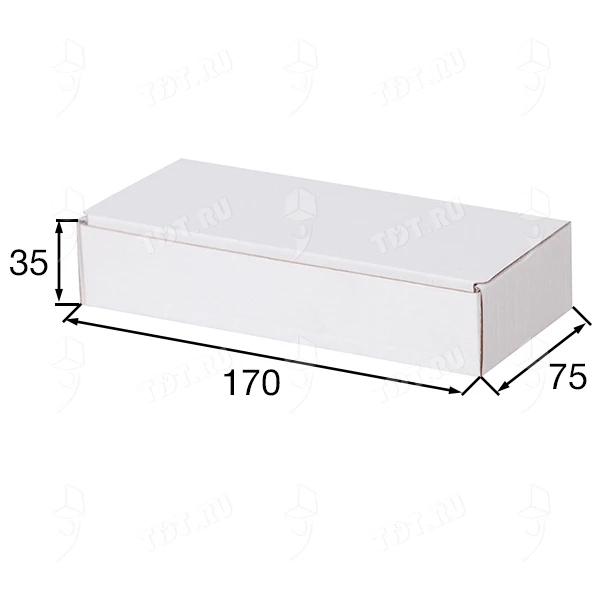 Короб КС-415 МГФ, серии КС-400, белый, длиной 170 мм, шириной 75 мм и высотой 35 мм. Изготовлен из микрогофрокартона Т-23. Полезный объём — 0.4 л.