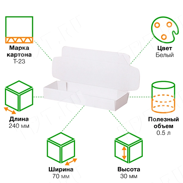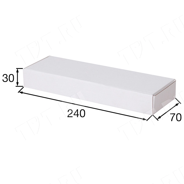 Короб КС-416 МГФ, серии КС-400, белый, длиной 240 мм, шириной 70 мм и высотой 30 мм. Изготовлен из микрогофрокартона Т-23. Полезный объём — 0.5 л.