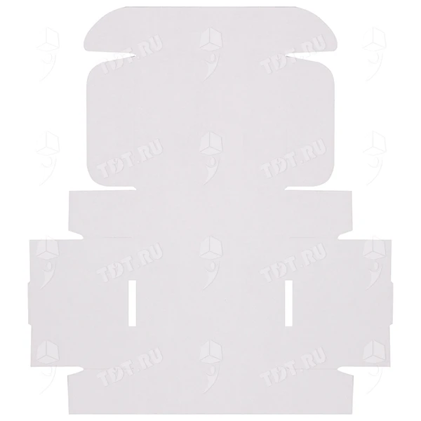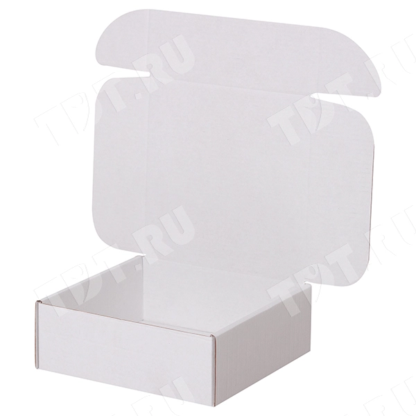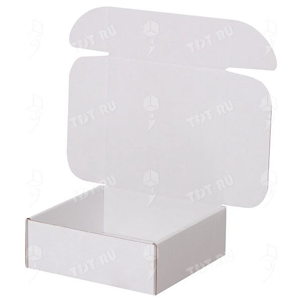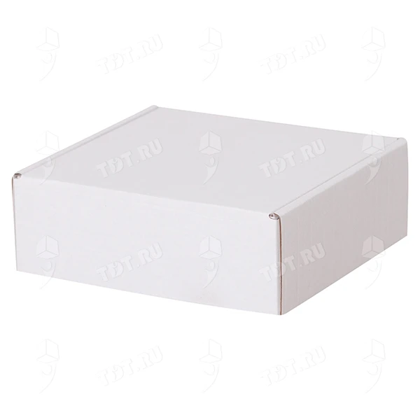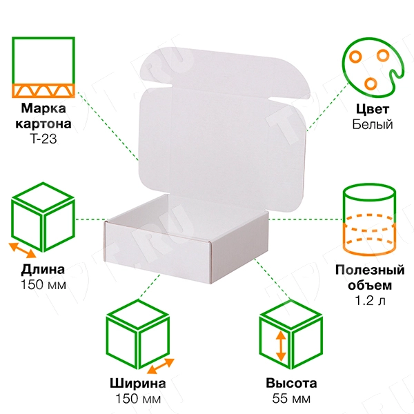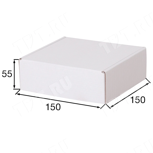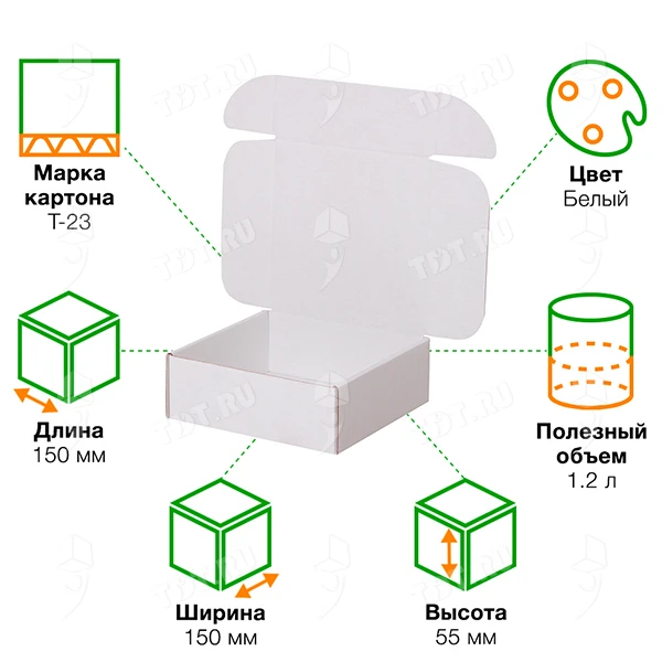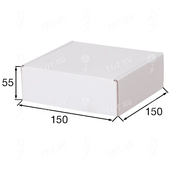 Короб КС-421 МГФ, серии КС-400, белый, длиной 150 мм, шириной 150 мм и высотой 55 мм. Изготовлен из микрогофрокартона Т-23. Полезный объём — 1.2 л.