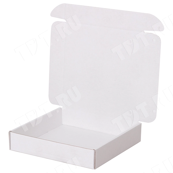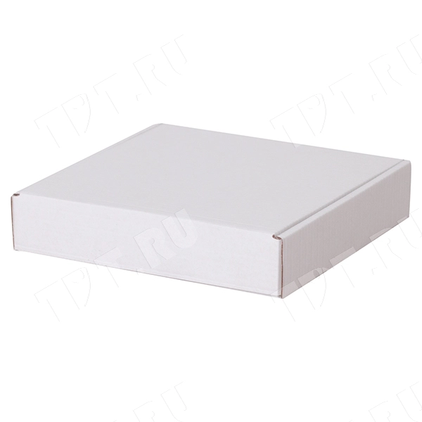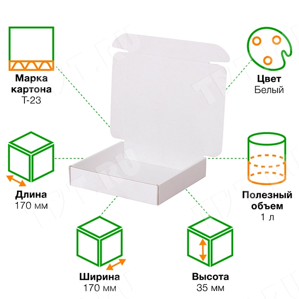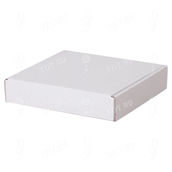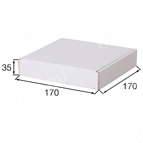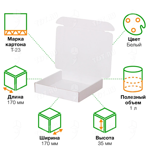 Короб КС-424 МГФ, серии КС-400, белый, длиной 170 мм, шириной 170 мм и высотой 35 мм. Изготовлен из микрогофрокартона Т-23. Полезный объём — 1 л.