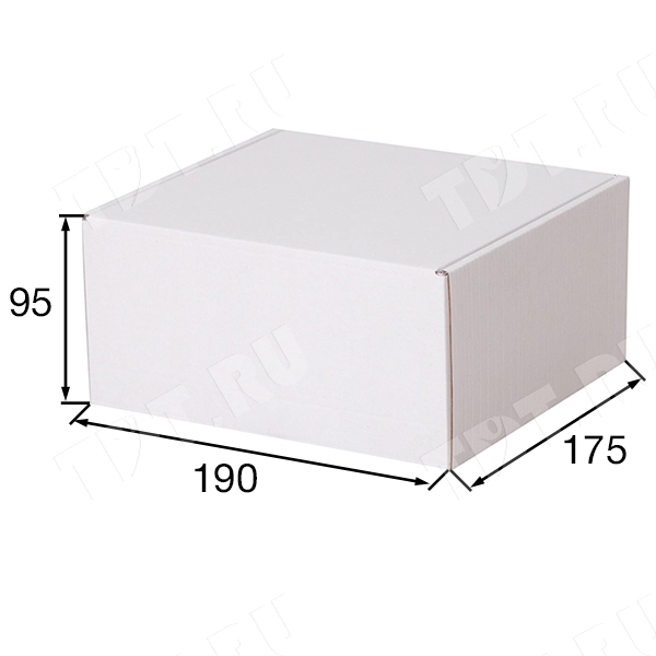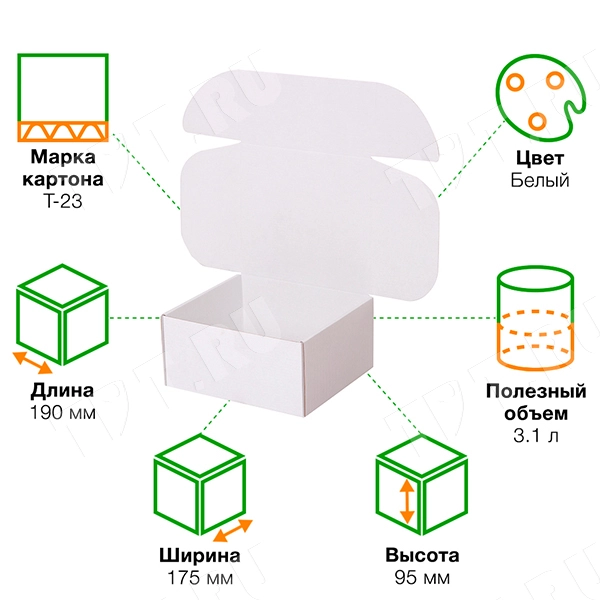 Короб КС-427 МГФ, серии КС-400, белый, длиной 190 мм, шириной 175 мм и высотой 95 мм. Изготовлен из микрогофрокартона Т-23. Полезный объём — 3.1 л.