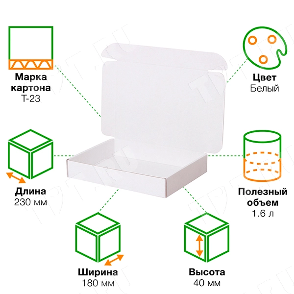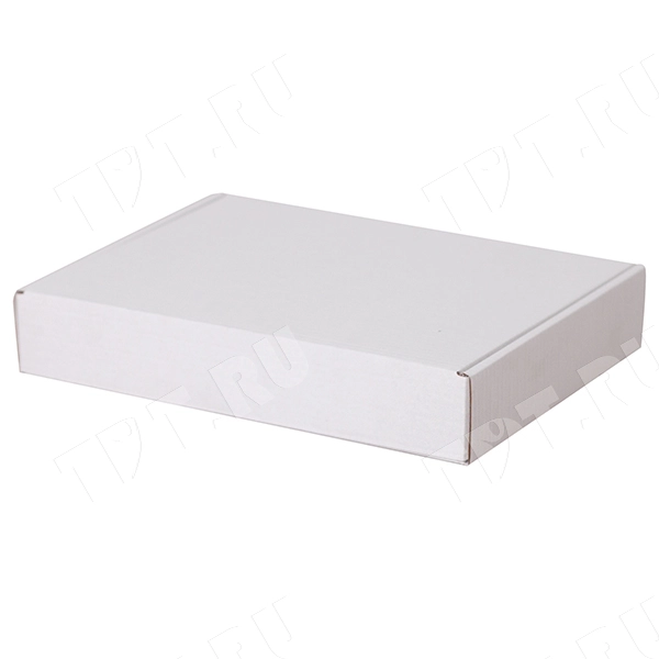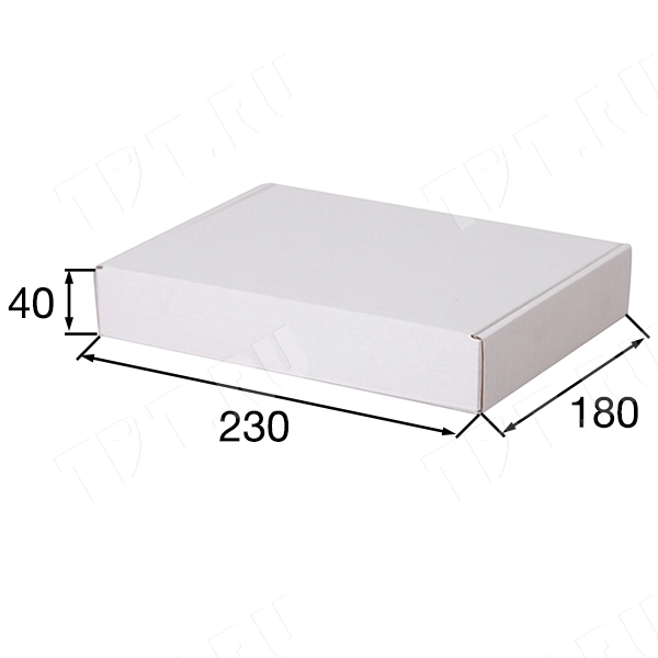 Короб КС-429 МГФ, серии КС-400, белый, длиной 230 мм, шириной 180 мм и высотой 40 мм. Изготовлен из микрогофрокартона Т-23. Полезный объём — 1.6 л.