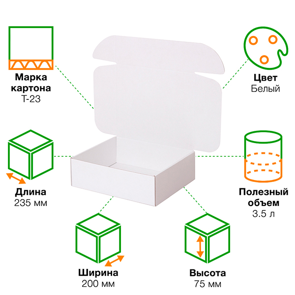 Короб КС-430 МГФ, серии КС-400, белый, длиной 235 мм, шириной 200 мм и высотой 75 мм. Изготовлен из микрогофрокартона Т-23. Полезный объём — 3.5 л.