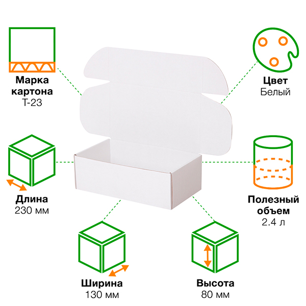 Короб КС-432 МГФ, серии КС-400, белый, длиной 230 мм, шириной 130 мм и высотой 80 мм. Изготовлен из микрогофрокартона Т-23. Полезный объём — 2.4 л.