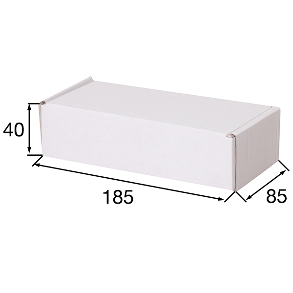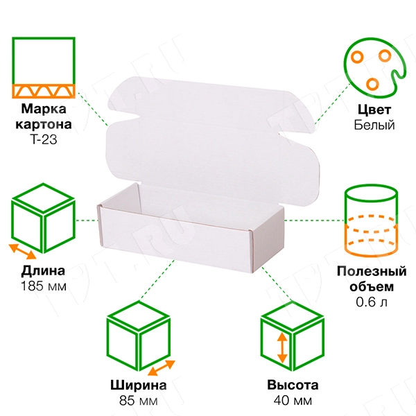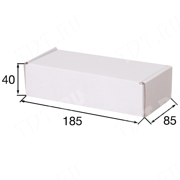 Короб КС-434 МГФ, серии КС-400, белый, длиной 185 мм, шириной 85 мм и высотой 40 мм. Изготовлен из микрогофрокартона Т-23. Полезный объём — 0.6 л.