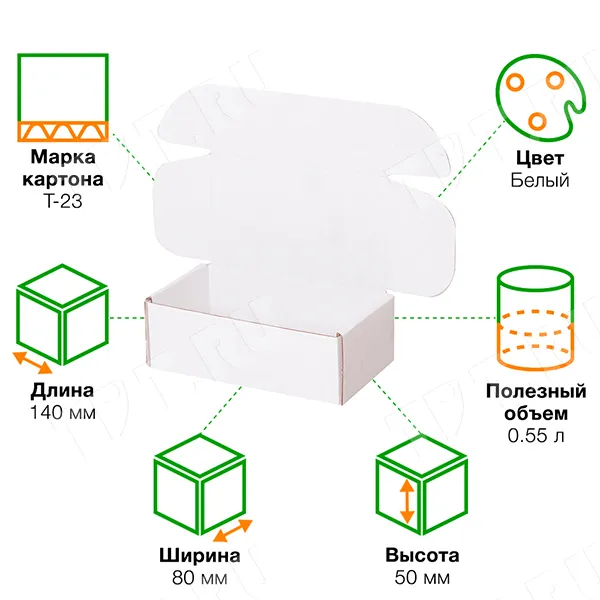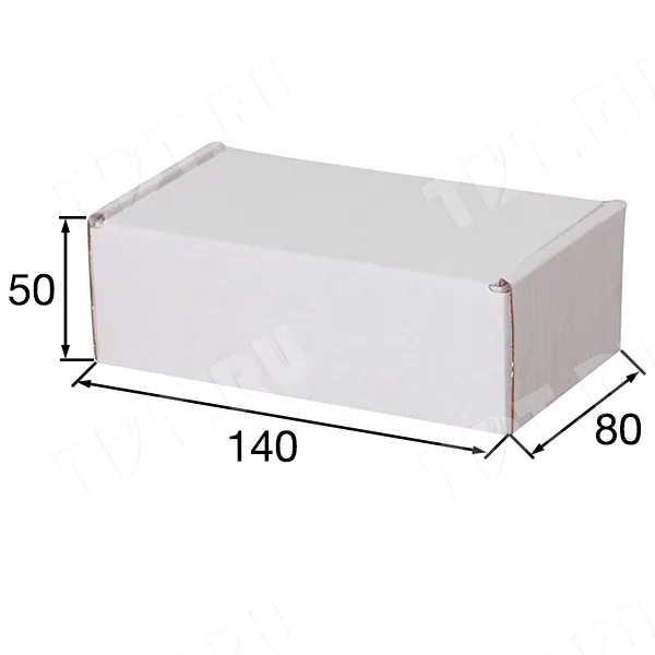 Короб КС-436 МГФ, серии КС-400, белый, длиной 140 мм, шириной 80 мм и высотой 50 мм. Изготовлен из микрогофрокартона Т-23. Полезный объём — 0.55 л.
