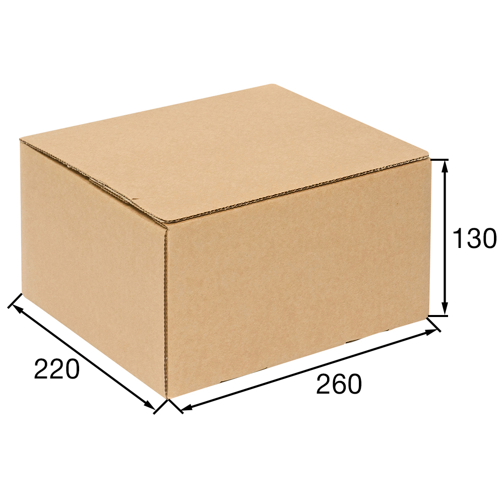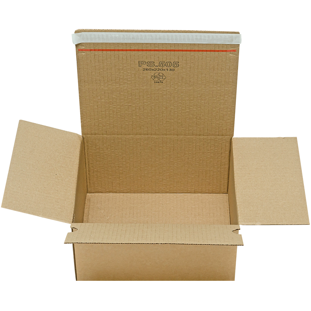 Почтовый короб PS.505 с клеевым клапаном, бурого цвета, длиной 260 мм, шириной 220 мм и высотой 130 мм. Изготовлен из трёхслойного гофрокартона Т-23 В. Полезный объём — 7.44 л.