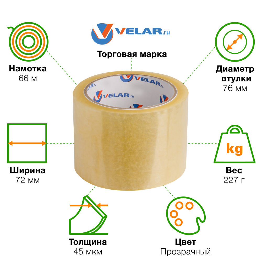 Клейкая лента прозрачная Velar, 72мм*66м*45мкм