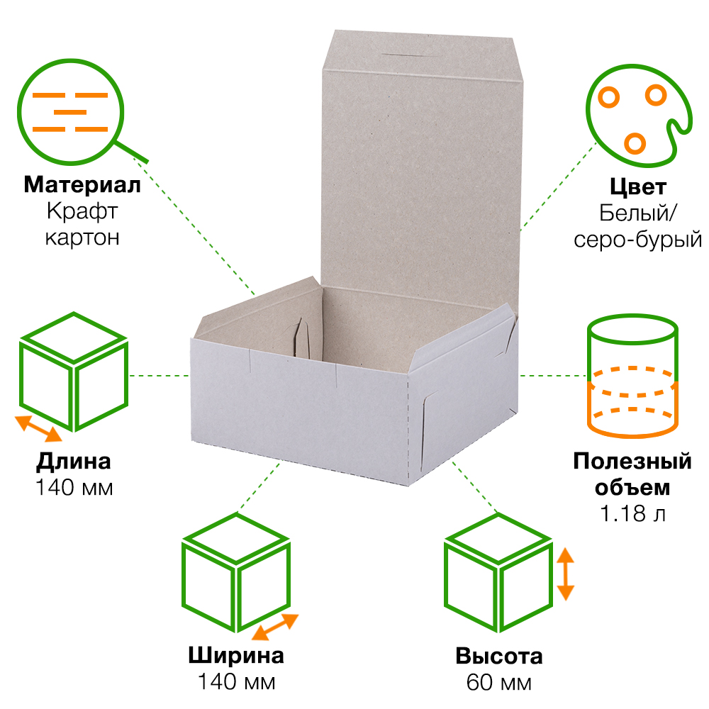 Коробка крафт кондитерская, беленая, длиной 140 мм, шириной 140 мм и высотой 60 мм. Изготовлена из крафт картона. Полезный объём — 1.18 л.