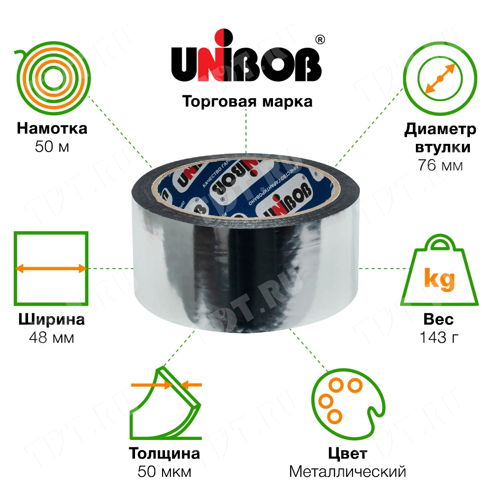 Металлизированная клейкая лента UNIBOB® шириной 48 мм, диаметром втулки 76 мм, намоткой 50 метров. Основа изделия - полипропилен, покрытый алюминиевым напылением, клеевой слой представляет собой акриловую эмульсию.