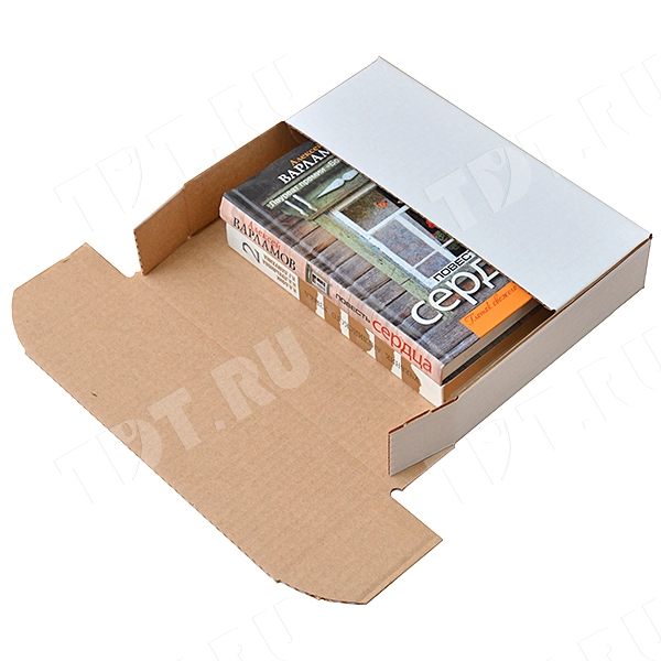Книжный лоток №8, белый, длиной 250 мм, шириной 175 мм и высотой 50 мм. Изготовлен из трёхслойного картона Т-23 В. Полезный объём — 2.2 л.