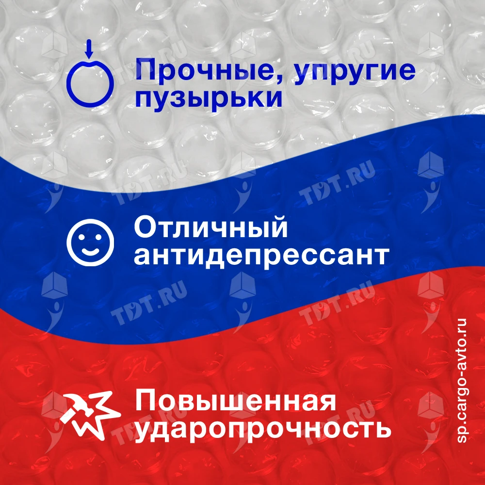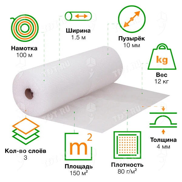 Прозрачная трехслойная воздушно-пузырчатая пленка «Премиум», намоткой 100 м, шириной рулона 1.5 м, диаметром пузырька 10 мм, плотностью 80 г/м². Изготовлена из полиэтилена. Производится в России.