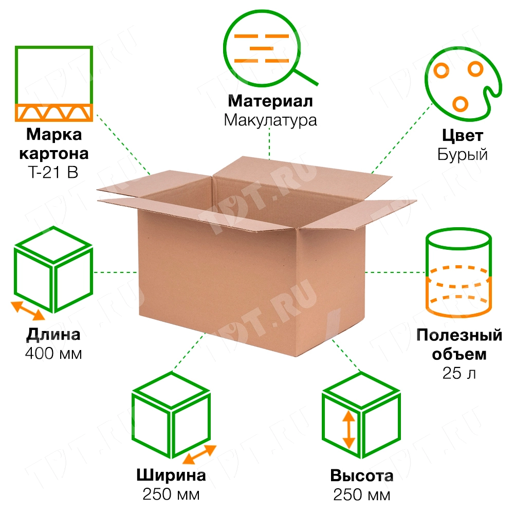 Картонный короб №108 для переезда, длиной 400 мм, шириной 250 мм и высотой 250 мм. Изготовлен из трехслойного картона марки Т-21 В. Полезный объём — 25 л.