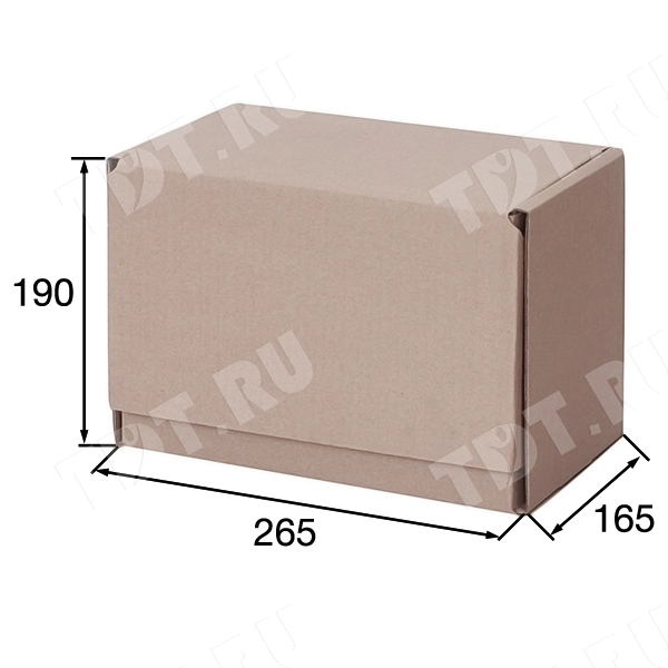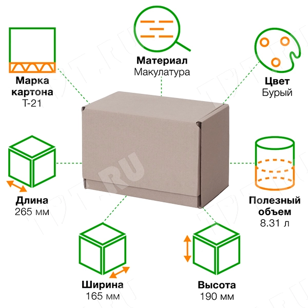 Почтовый короб «Бизнес» тип «Г» бурого цвета, длиной 265 мм, шириной 165 мм и высотой 190 мм. Изготовлен из трёхслойного гофрокартона Т-21. Полезный объём — 8.31 л.