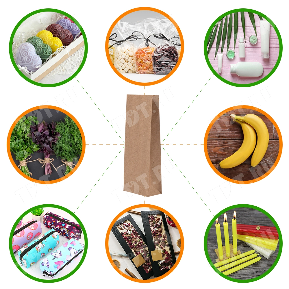Пакеты без ручек используются для упаковки, переноски, хранения продуктов питания и бытовых товаров. Они незаменимы в пекарнях, кафе, ресторанах и на фудкортах.
