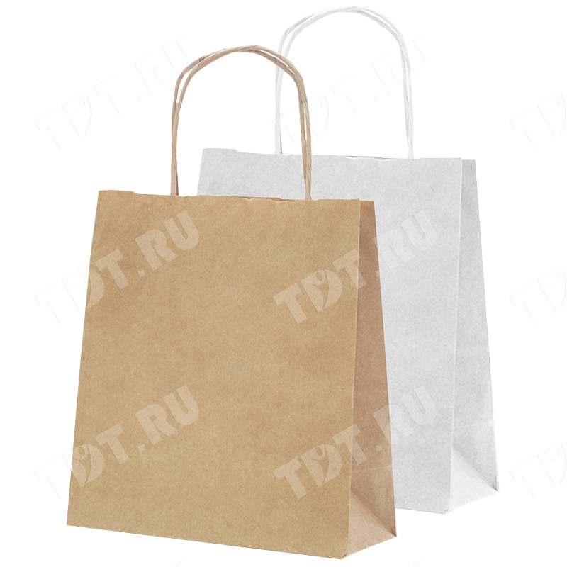 Бумажный крафт пакет с крученой ручкой шириной 150 мм, длиной 260 мм, высотой 350 мм изготовлен из экологичного материала. Пакеты производятся в России.