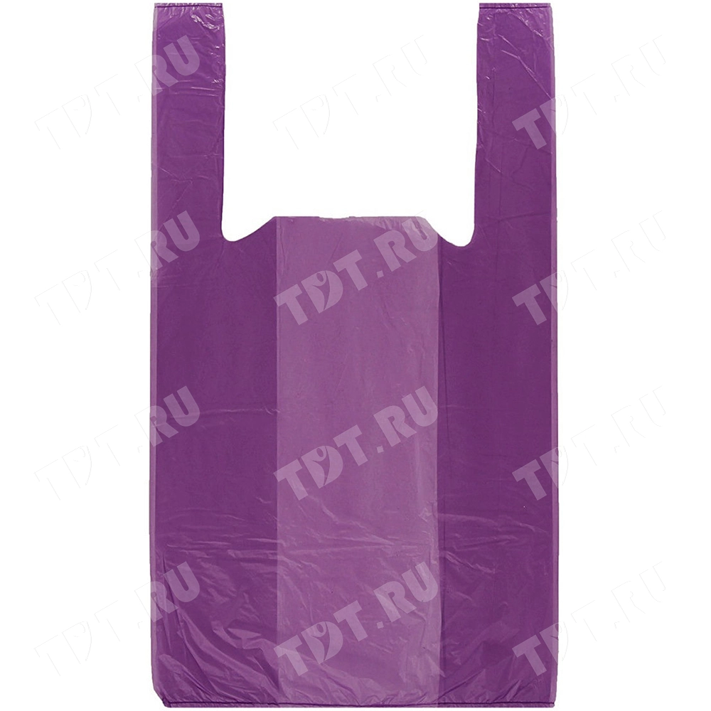 Полиэтиленовые пакеты майка ПНД без надписей, фиолетового цвета, длиной 50 см, шириной 28+14 см, толщиной 10 мкм, в упаковке 100 штук. Материал – полиэтилен низкого давления. Производятся в России.
