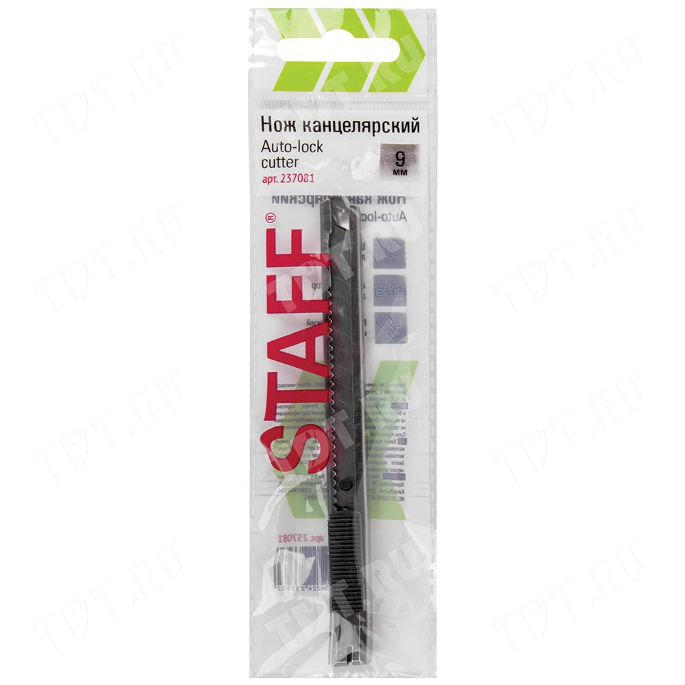 Нож канцелярский STAFF с отламываемым лезвием, код производителя 237081, Auto-lock cutter, шириной 9 мм. Материал – металл. Производится в Китае.