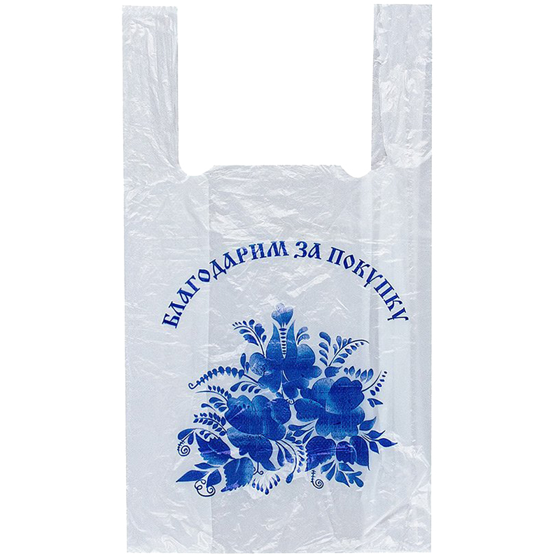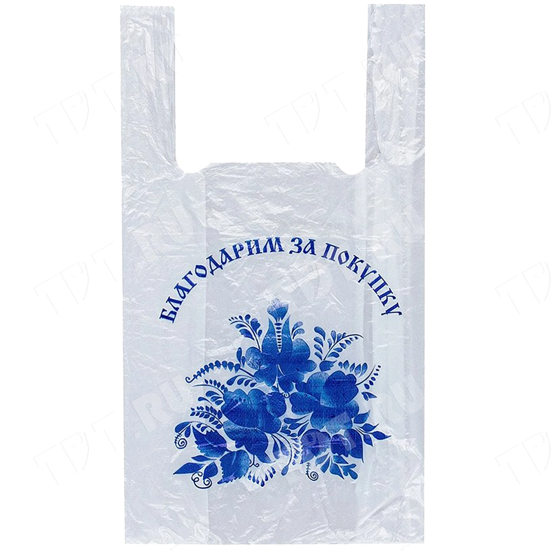Полиэтиленовые пакеты майка ПНД «Гжель», с надписью «Благодарим за покупку!», белого цвета, длиной 50 см, шириной 28+16 см, толщиной 12 мкм, в упаковке 100 штук. Материал – полиэтилен низкого давления. Производятся в России.