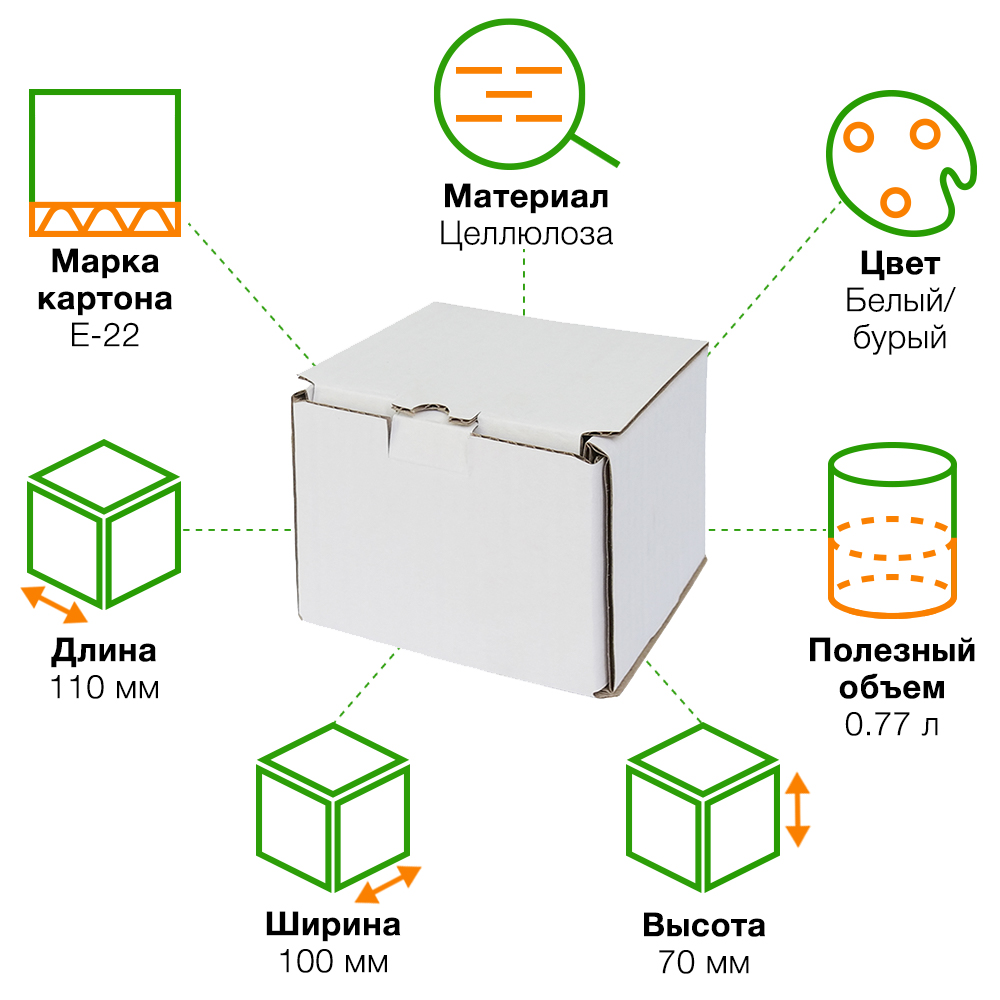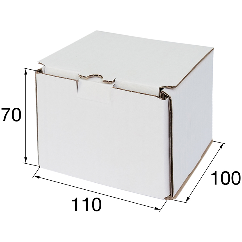 Короб №199/1 (премиум) белёный, длиной 110 мм, шириной 100 мм и высотой 70 мм. Изготовлен из микрогофрокартона Е-22. Полезный объём — 0.77 л.