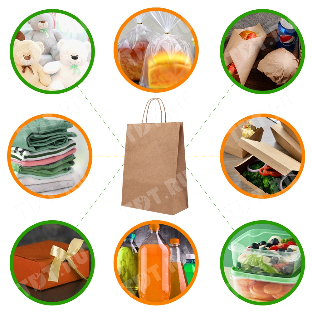 Пакеты с кручёной ручкой используются для упаковки, переноски, хранения продуктов питания и бытовых товаров. Они незаменимы в магазинах, пекарнях, кафе, ресторанах и на фудкортах.