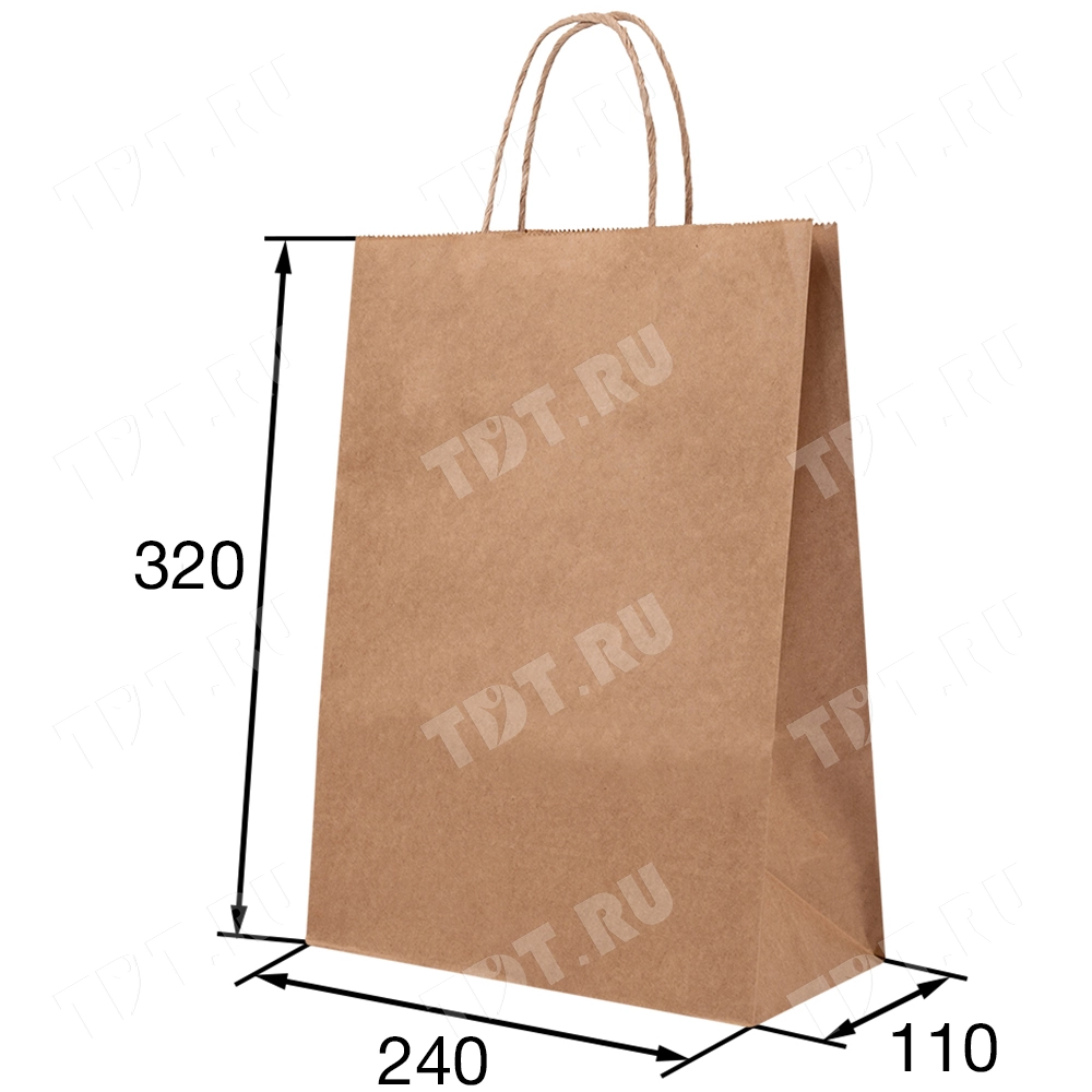 Бумажный крафт-пакет с кручёной ручкой шириной 110 мм, длиной 240 мм, высотой 320 мм, изготовлен из экологичного материала. Пакеты производятся в России.