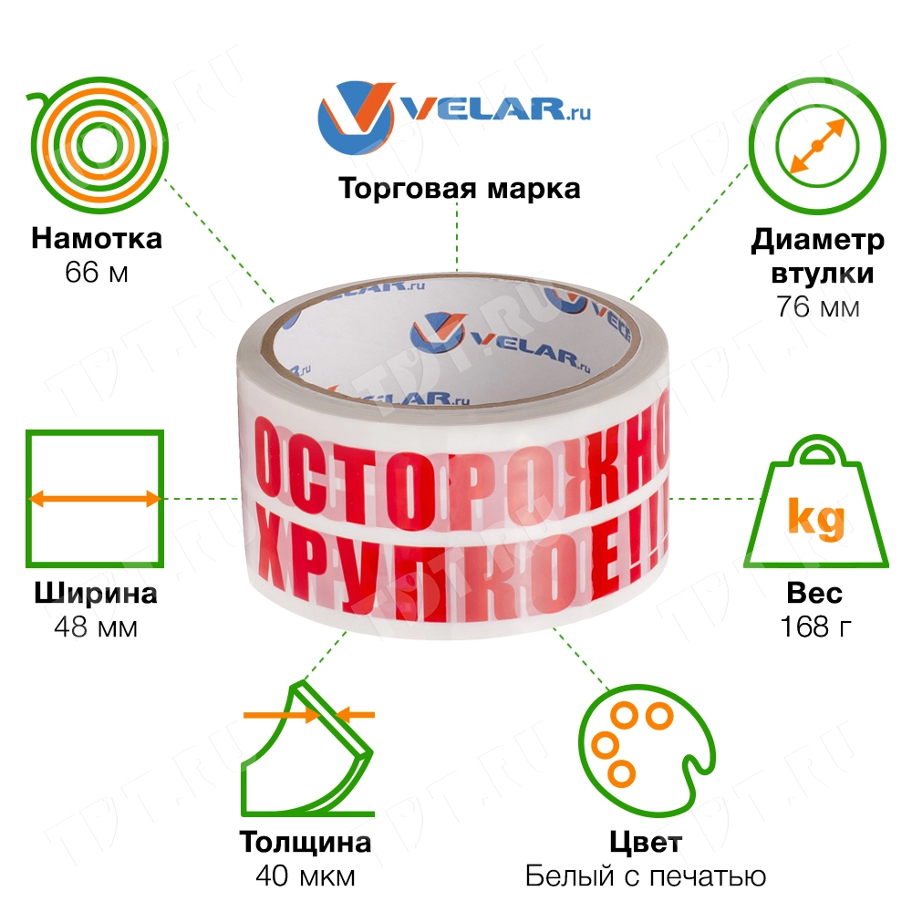 Клейкая лента Velar с печатью «Осторожно хрупкое», 48мм*66м*40мкм