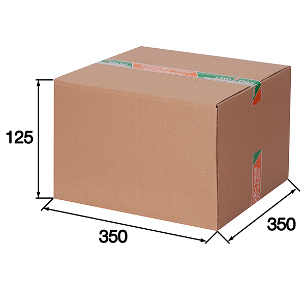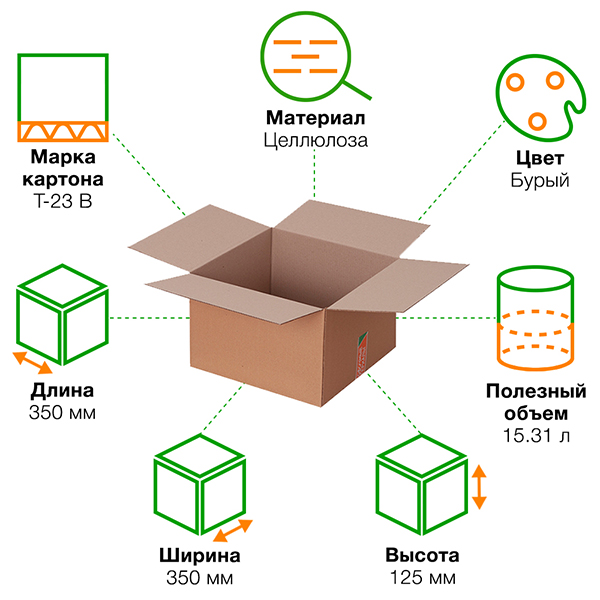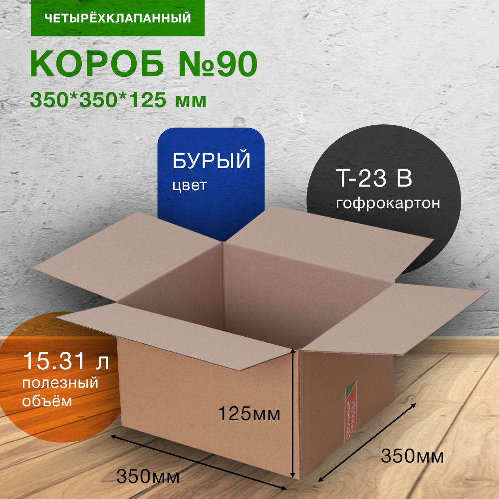 Короб К-90 бурого цвета, длиной 350 мм, шириной 350 мм и высотой 125 мм. Изготовлен из трехслойного картона марки Т-23 В. Полезный объём — 15.31 л.