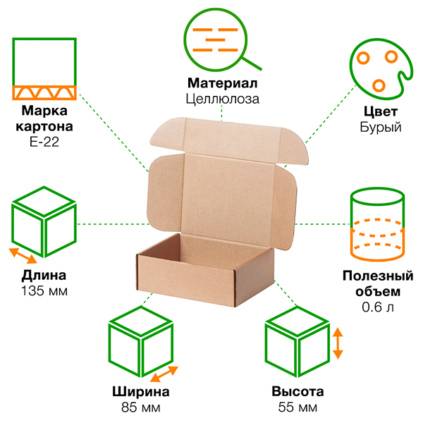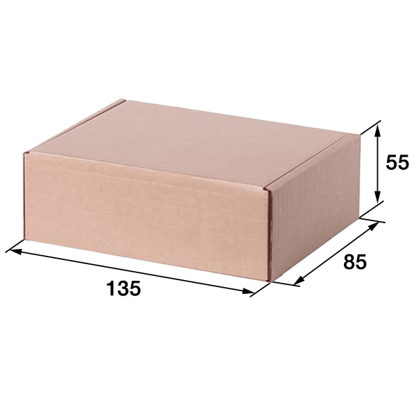 Короб №204 (премиум) бурого цвета, длиной 135 мм, шириной 85 мм и высотой 55 мм. Изготовлен из микрогофрокартона Е-22. Полезный объём — 0.6 л.
