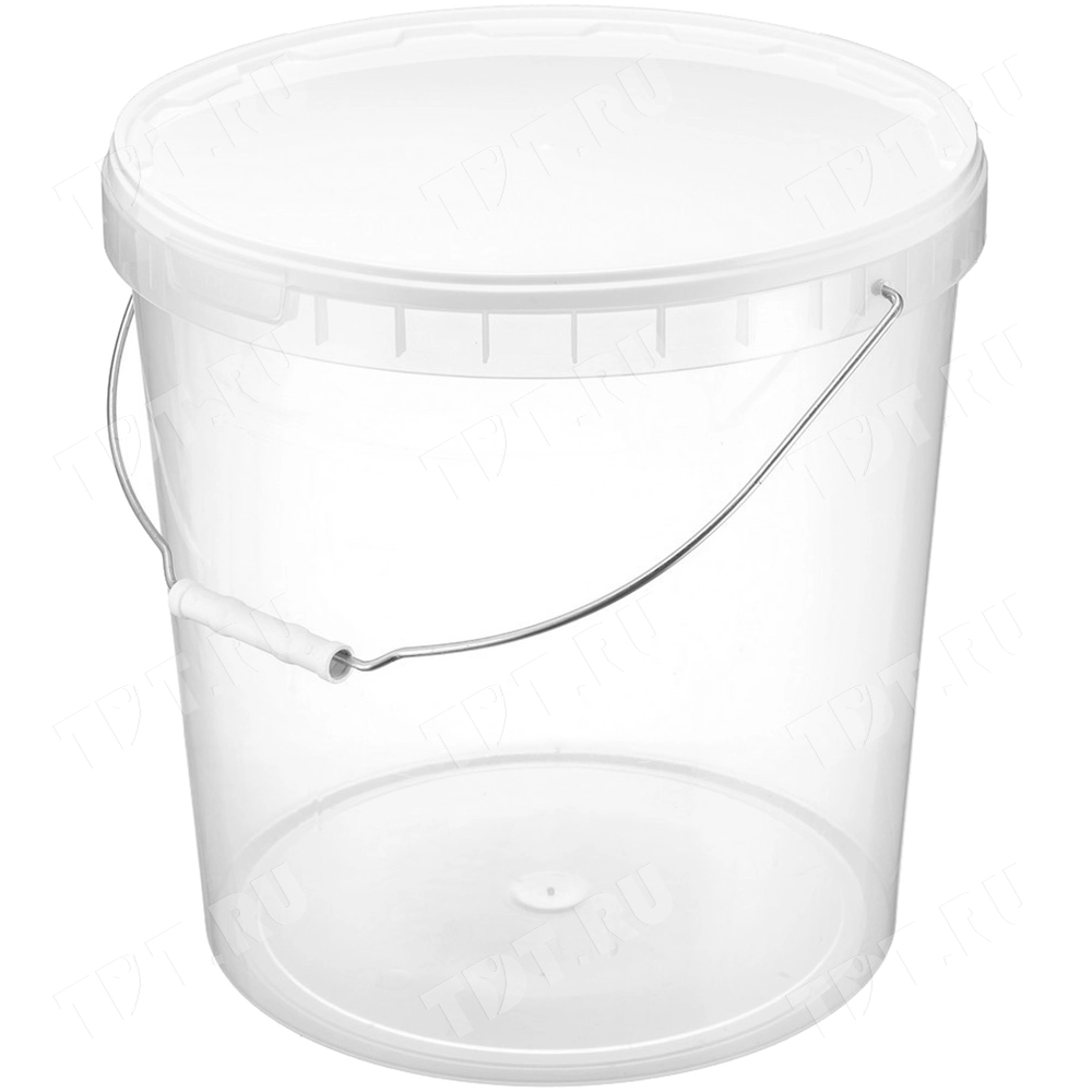 Прозрачные пластиковые ведра с крышками объемом 20 л, высотой 333 мм, диаметром верха 332 мм, низа 280 мм. Крышка наружным диаметром 330 мм, высотой 13 мм. Материал – полипропилен. Выдерживают широкий температурный интервал от -25 до +70 °C. Производятся в России.