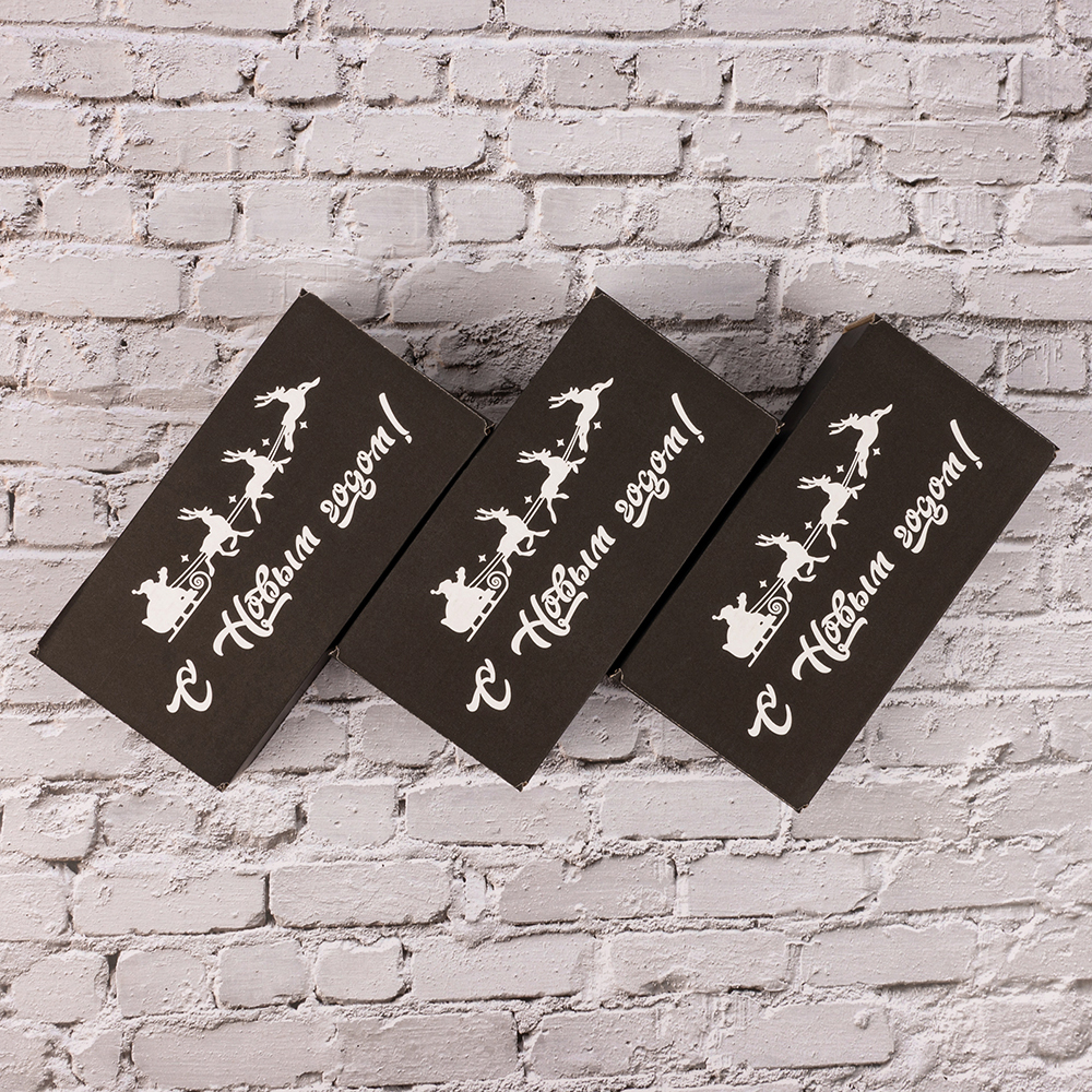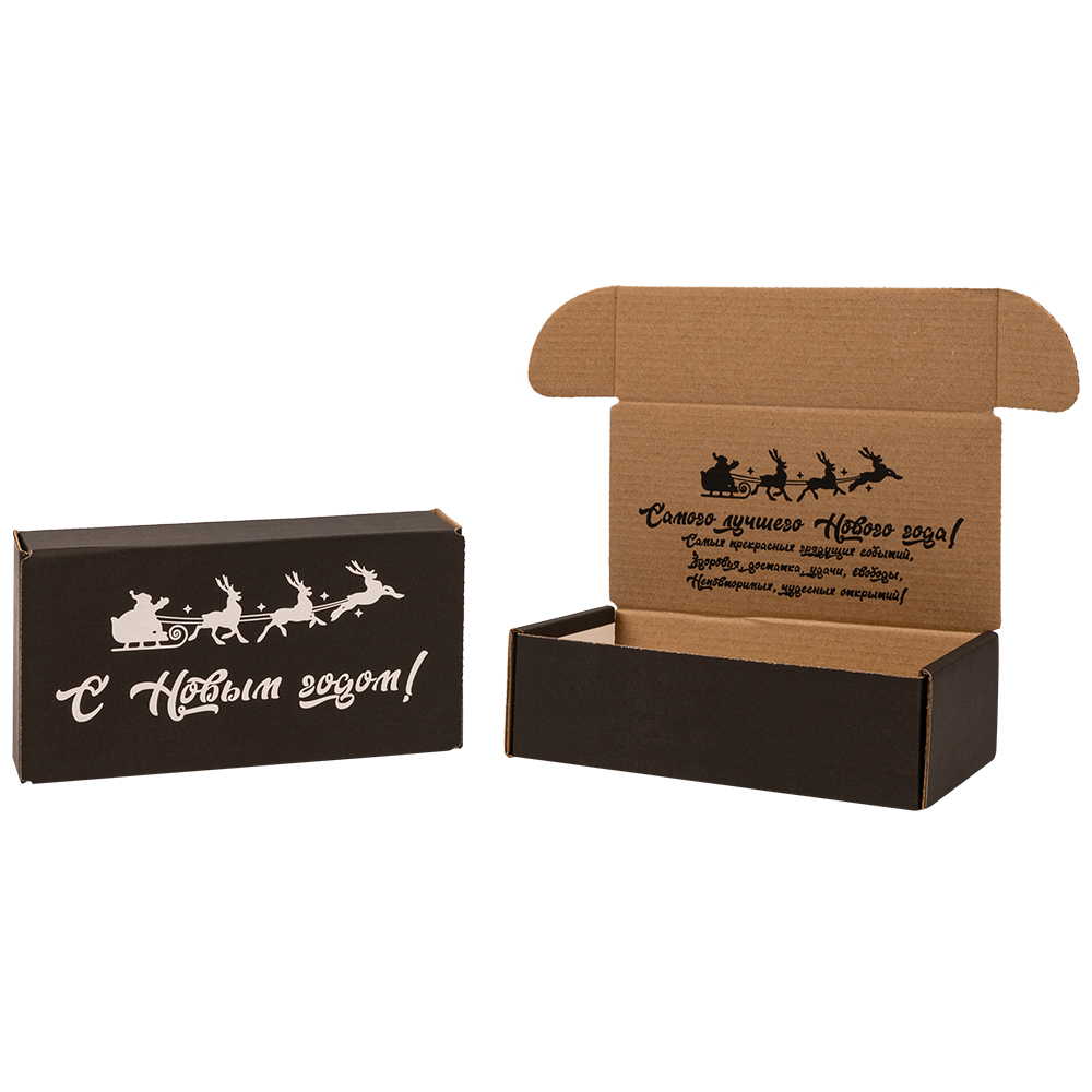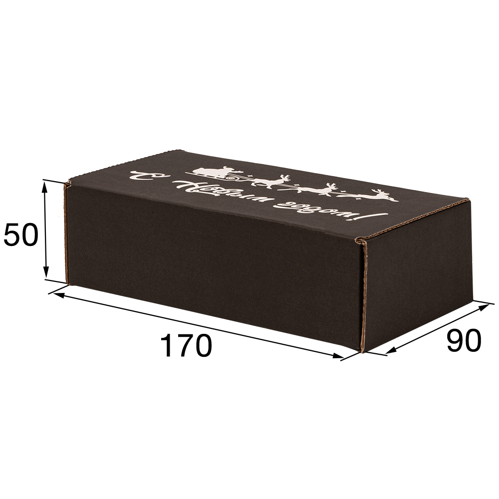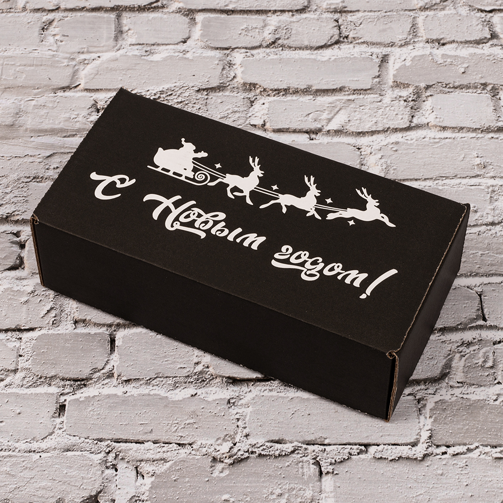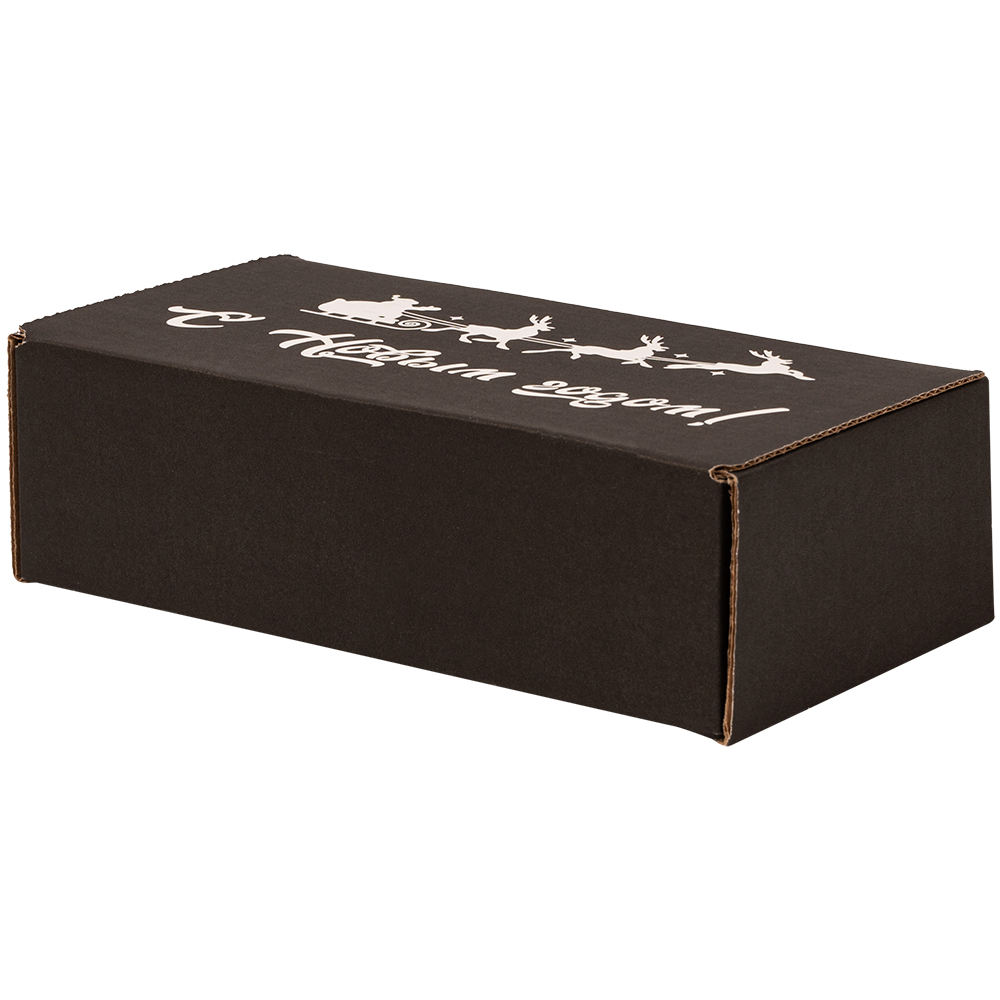 Подарочная коробка «С Новым годом!» чёрная, с поздравительной надписью, длиной 170 мм, шириной 90 мм и высотой 50 мм. Изготовлена из микрогофрокартона Е-22. Полезный объём — 0.76 л.