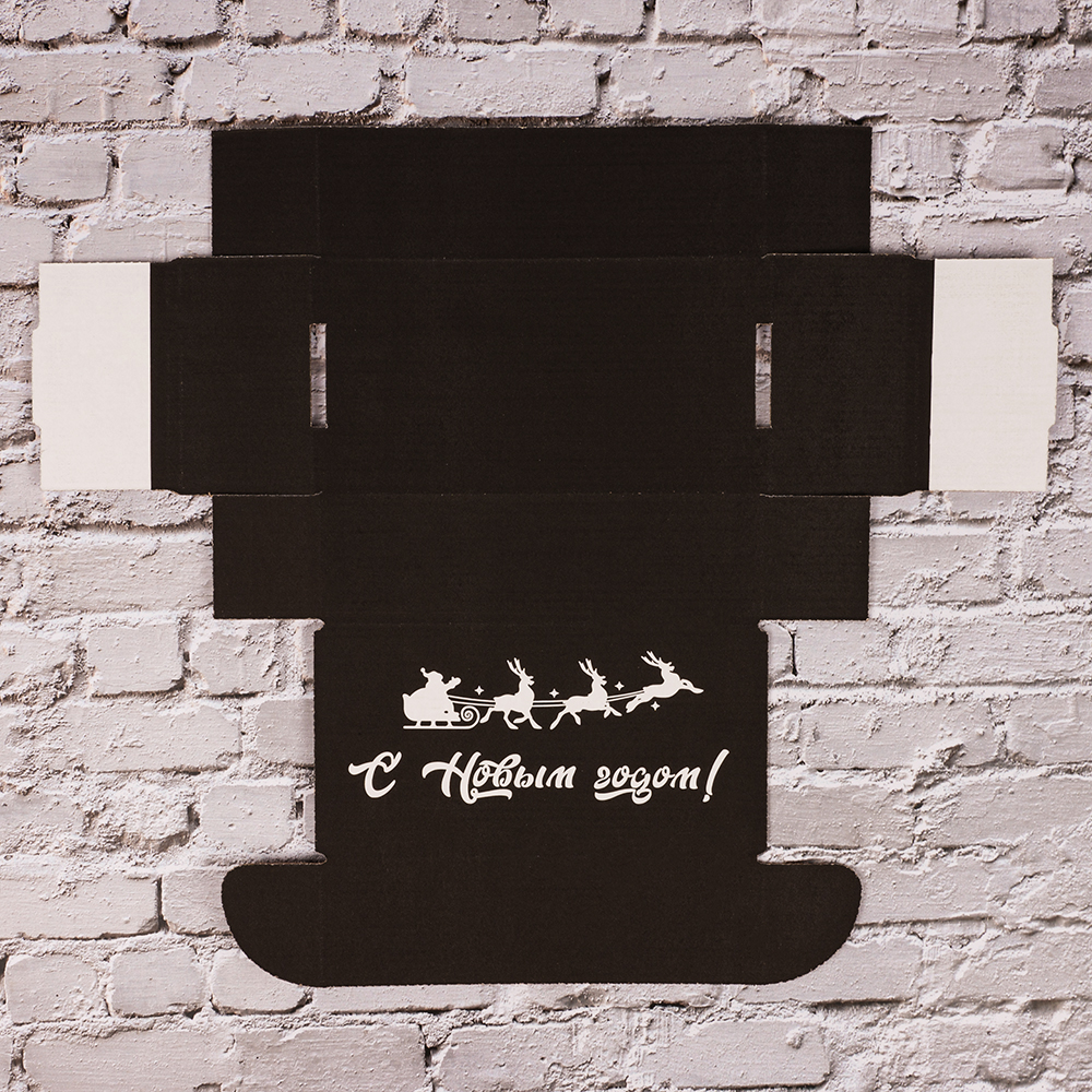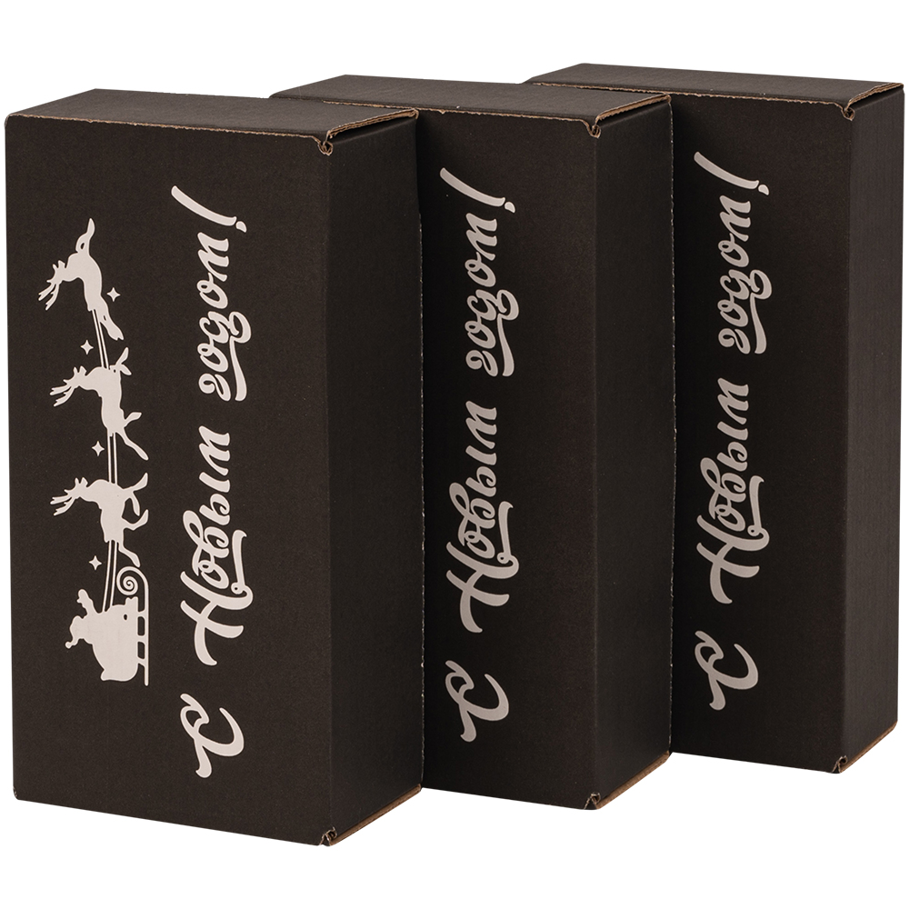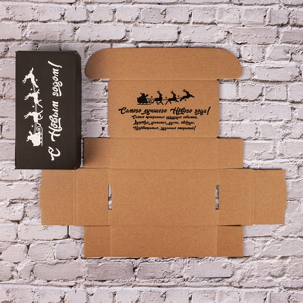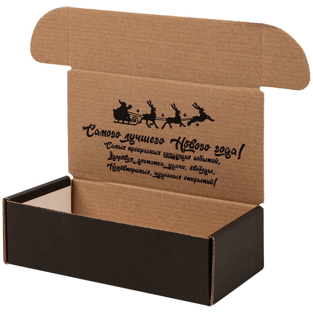 Подарочная коробка «С Новым годом!» чёрная, с поздравительной надписью, длиной 170 мм, шириной 90 мм и высотой 50 мм. Изготовлена из микрогофрокартона Е-22. Полезный объём — 0.76 л.