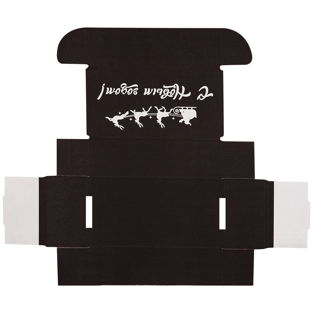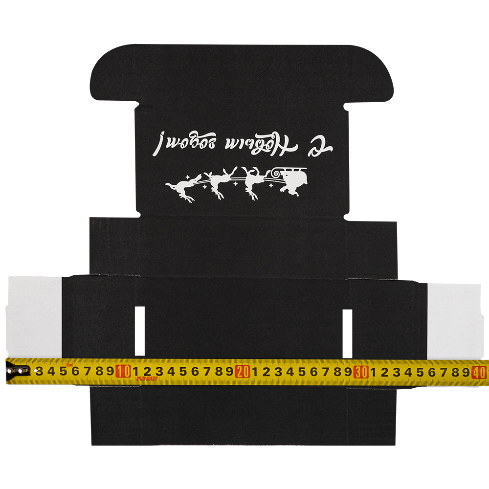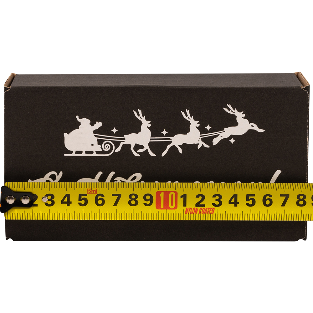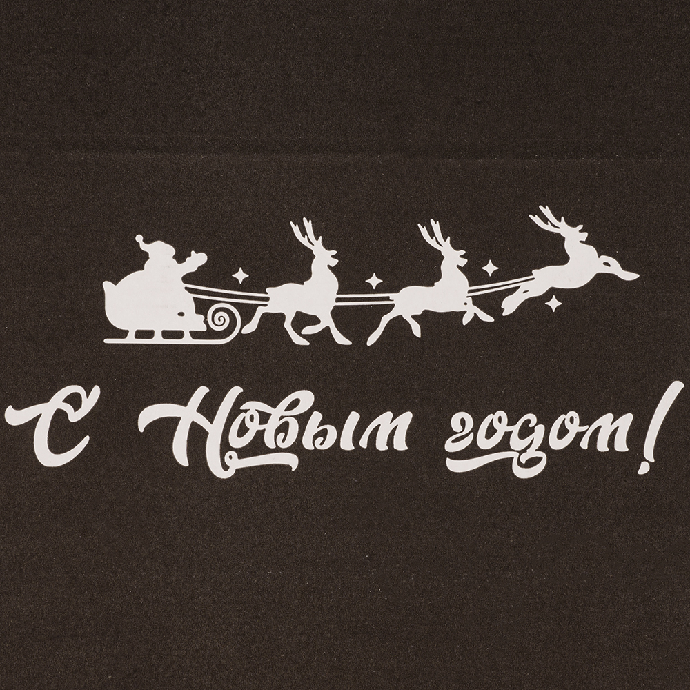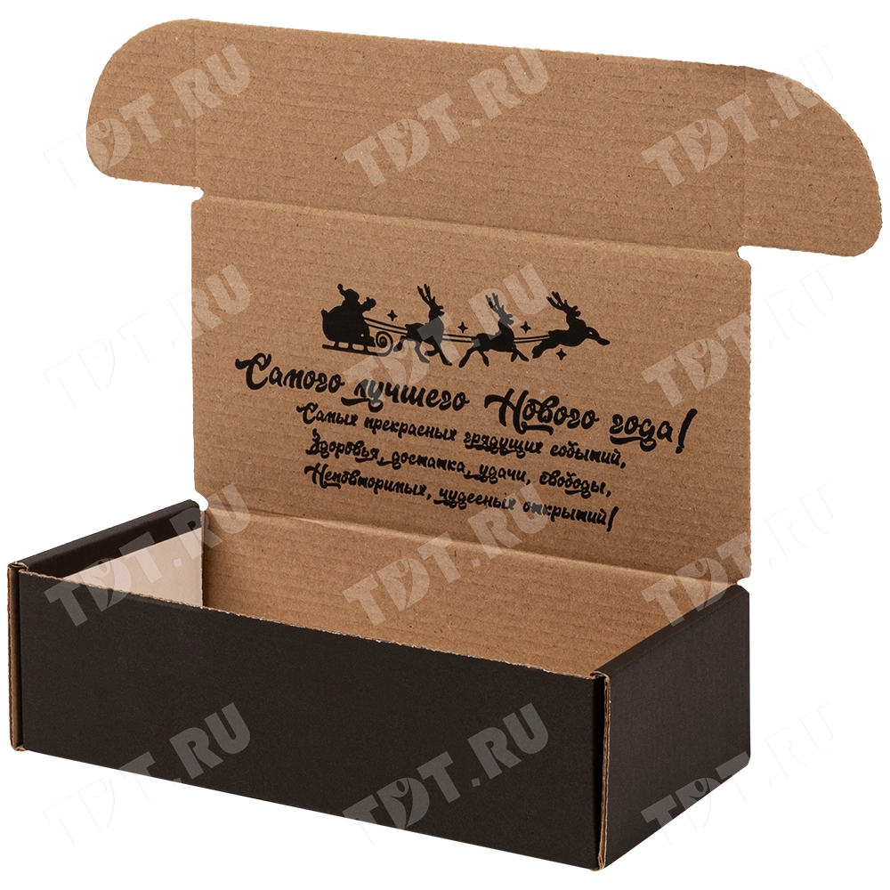 Подарочная коробка «С Новым годом!» чёрная, с поздравительной надписью, длиной 170 мм, шириной 90 мм и высотой 50 мм. Изготовлена из микрогофрокартона Е-22. Полезный объём — 0.76 л.
