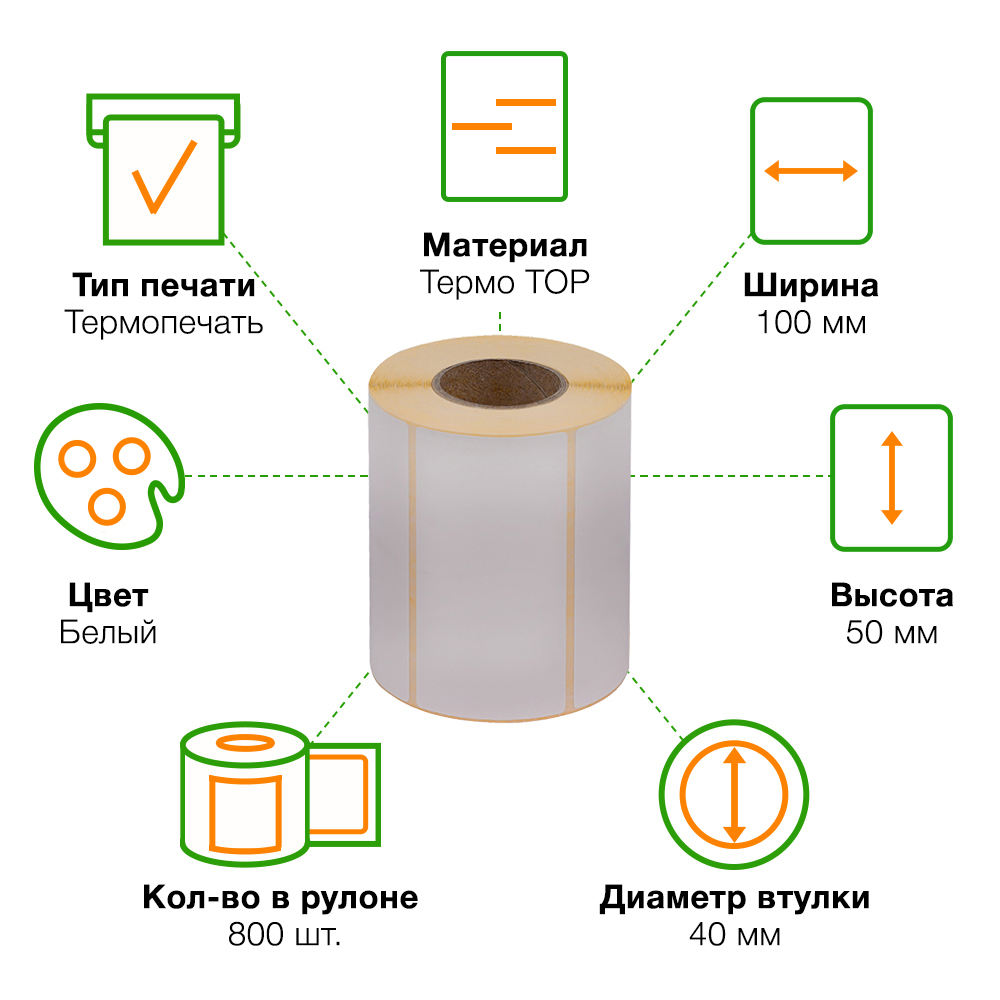 Самоклеящиеся этикетки TOP из многослойной бумаги белого цвета, шириной 100 мм, высотой 50 мм, диаметром втулки 40 мм, количеством в рулоне по 800 штук. Производятся в России. Термоэтикетки TOP в рулонах предназначены для печати на принтерах без риббона. На этикетках есть специальный слой, который при нагреве термоголовки принтера темнеет, за счет этого происходит печать.