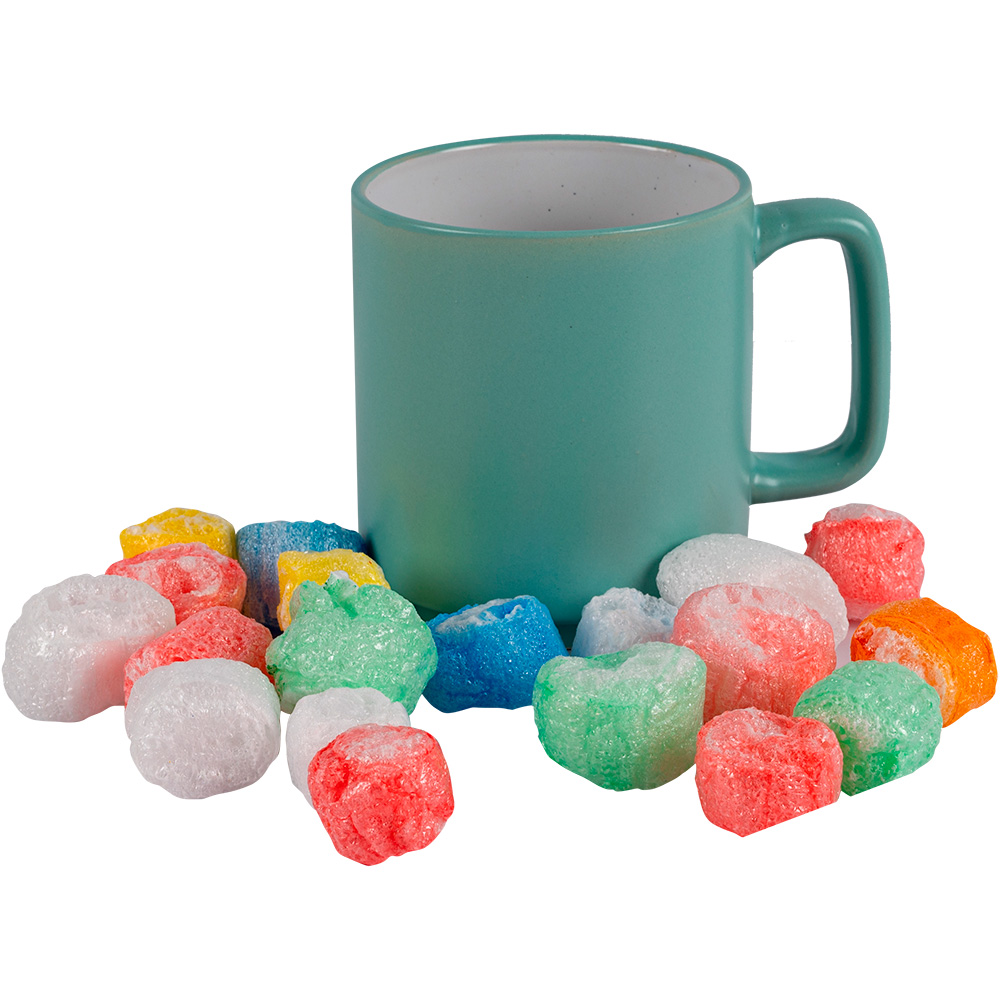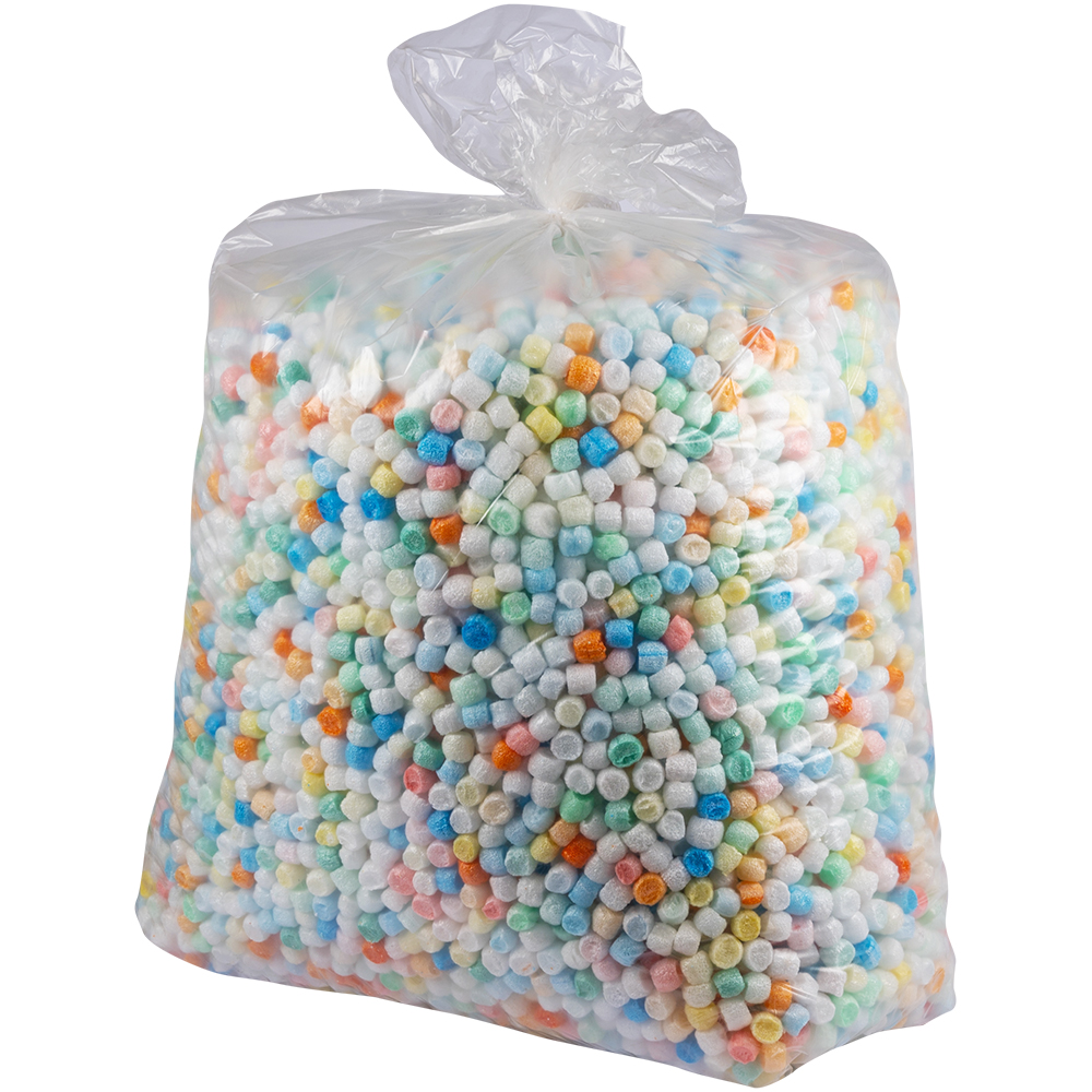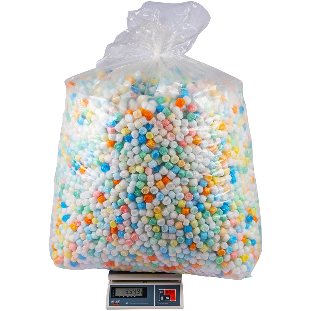 Полистирольный наполнитель «Конфетти», разноцветные, объемом 200 л, транспортным объемом 0.260975 м³. Размер одной конфетти – 26*23*22 мм. Производится в России.