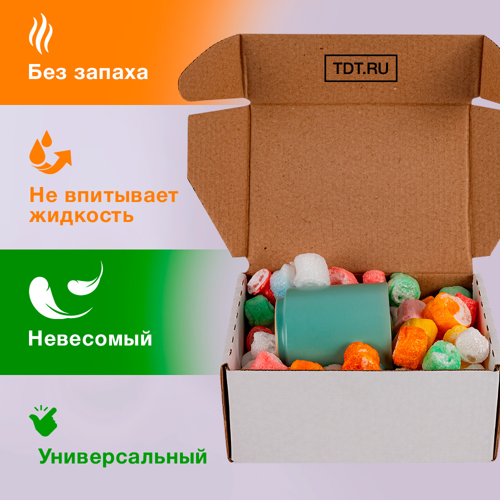 Область применения:Разноцветный насыпной наполнитель из пенопласта применяется для упаковки, хранения и транспортировки различных грузов. Заполняет пространство, гарантируя устойчивость и защиту хрупких предметов. Подходит для оформления подарочной упаковки. Легкий, поэтому особого влияния на увеличение груза отправления не окажет. Пенопласт обладает хорошей амортизацией и гасит удары по коробке, и тряску. Наполнитель не смещается, не боится влаги, не крошится и не электризуется.