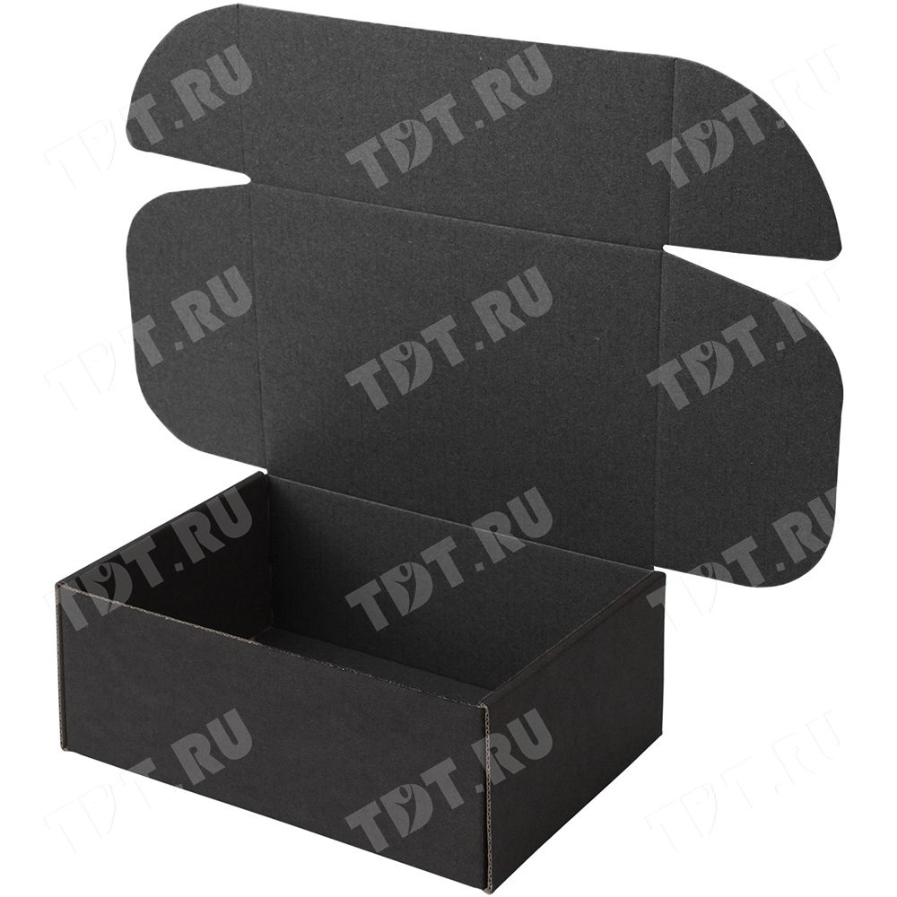 Короб №205 (премиум), чёрный, длиной 180 мм, шириной 110 мм и высотой 85 мм. Изготовлен из микрогофрокартона Е-22. Полезный объём — 1.68 л.