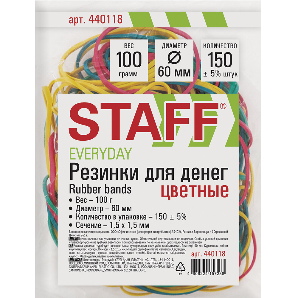 Банковские резинки STAFF разноцветные, серия Everyday, весом 100 г (без учёта упаковки), толщиной 1.5 мм, диаметром 60 мм.