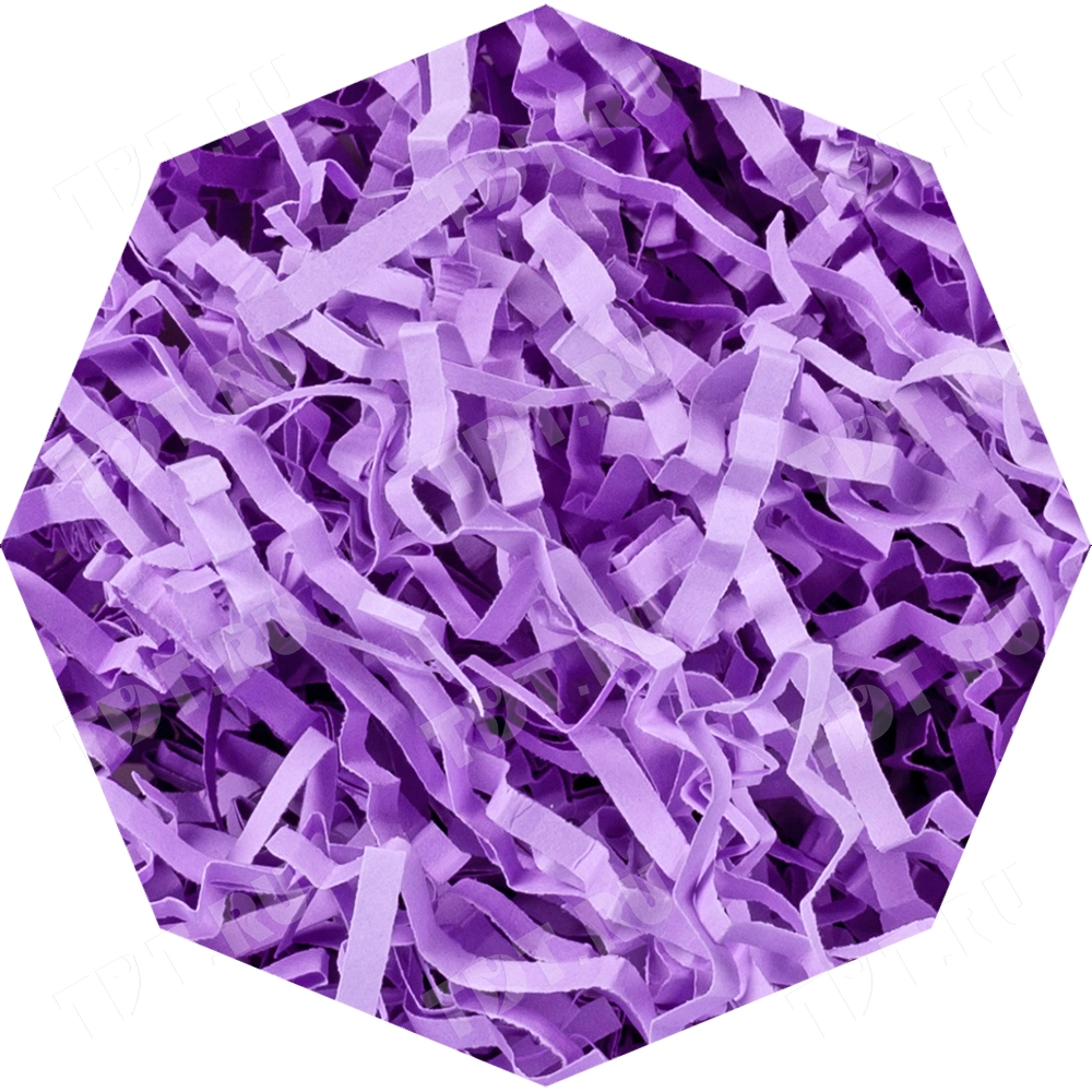 Бумажный подарочный наполнитель «Лавандовые поля» из простой бумаги, цвета лавандовых полей, весом 1 кг, плотностью 80 г/м², шириной резки 2-3 мм. Производится в России.