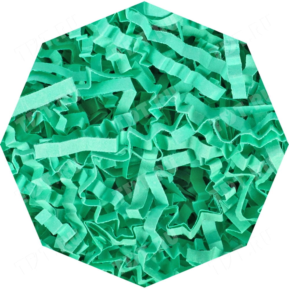 Бумажный подарочный наполнитель «Мятный» из простой бумаги, мятного цвета, весом 1 кг, плотностью 80 г/м², шириной резки 2-3 мм. Производится в России.