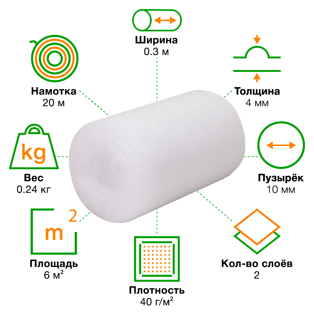 Прозрачная двухслойная воздушно-пузырчатая пленка «Компакт» без втулки, намоткой 20 м, шириной рулона 0.3 м, диаметром пузырька 10 мм. Рулон воздушно-пузырьковой пленки удобен в работе за счет небольшой ширины. Такой рулон удобно держать в руке, хранить дома и в автомобиле. Изготовлена из полиэтилена. Производится в России.