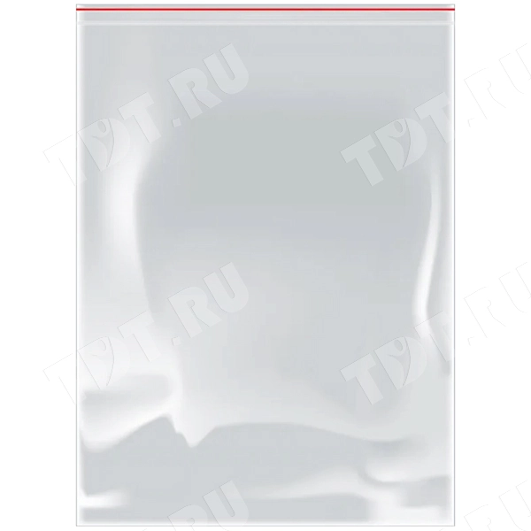 Пакеты Zip-Lock, прозрачного цвета с красной полосой, длиной 400 мм, шириной 300 мм, толщиной 70 мкм, в упаковке по 100 штук. Материал – полиэтилен высокого давления (ПВД). Производятся в России.